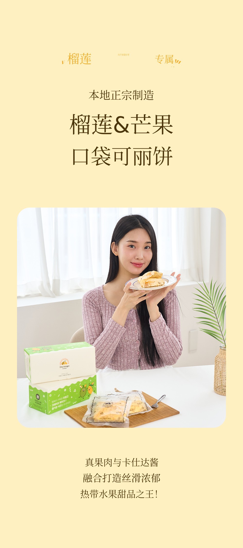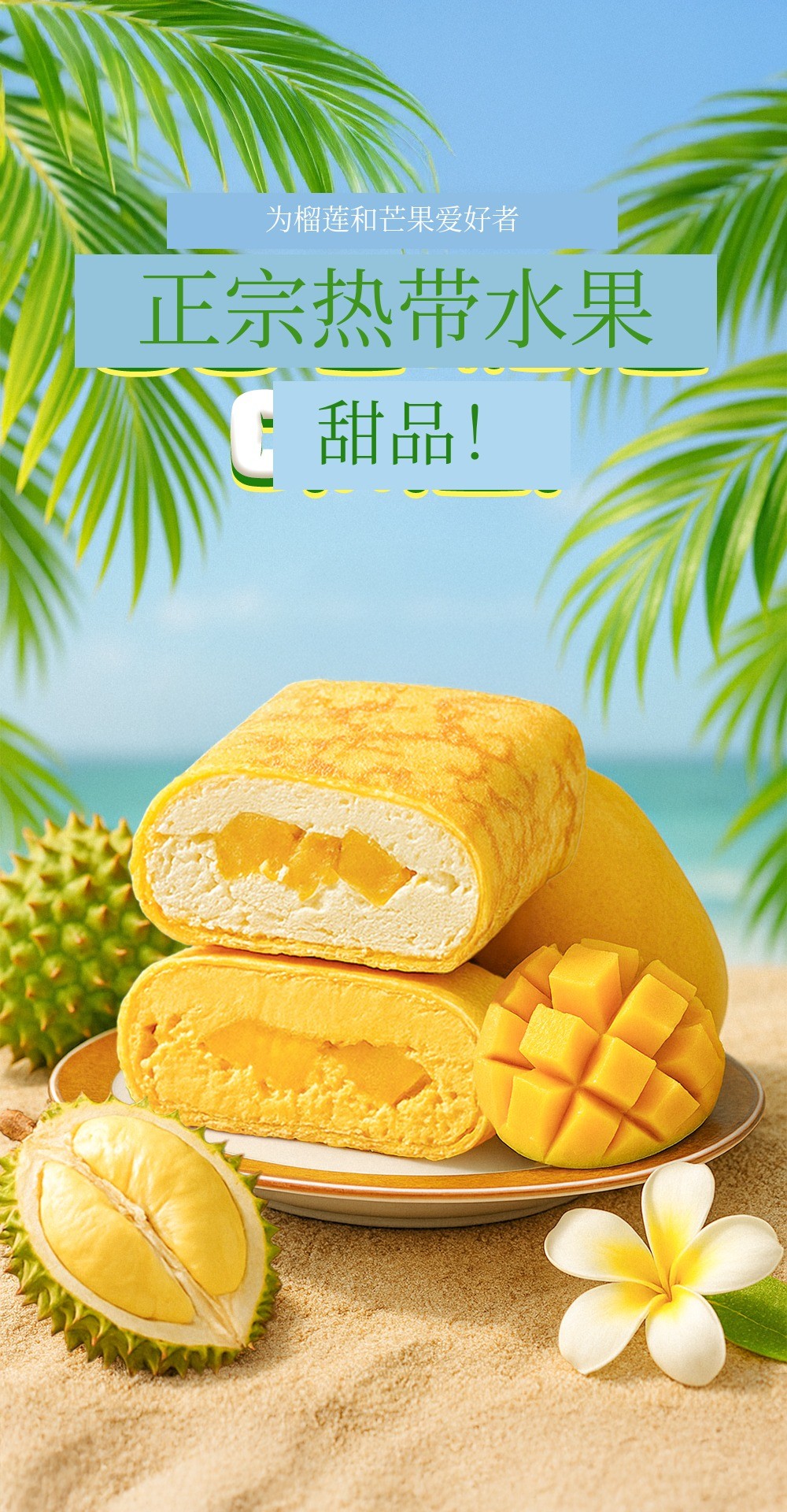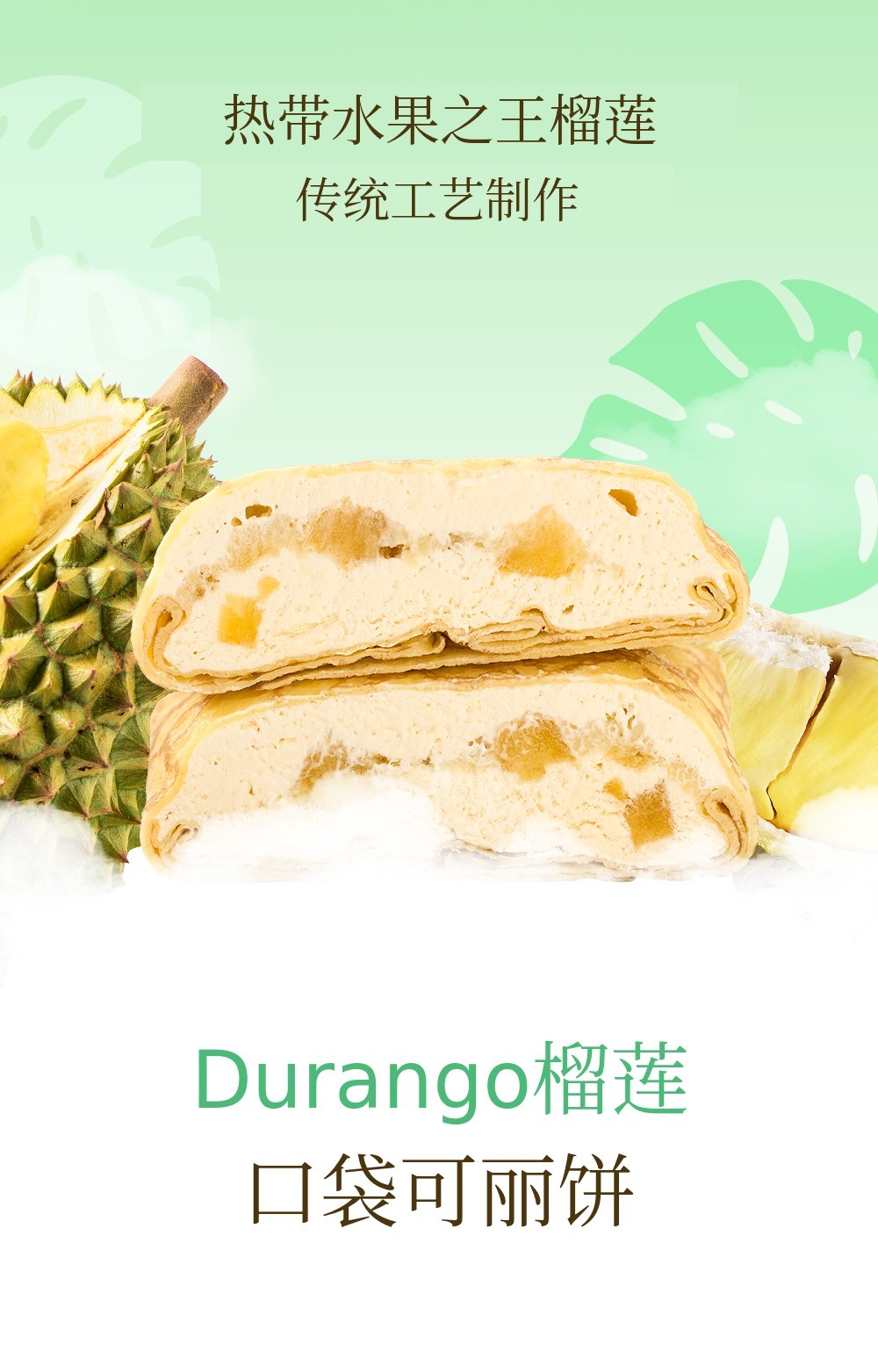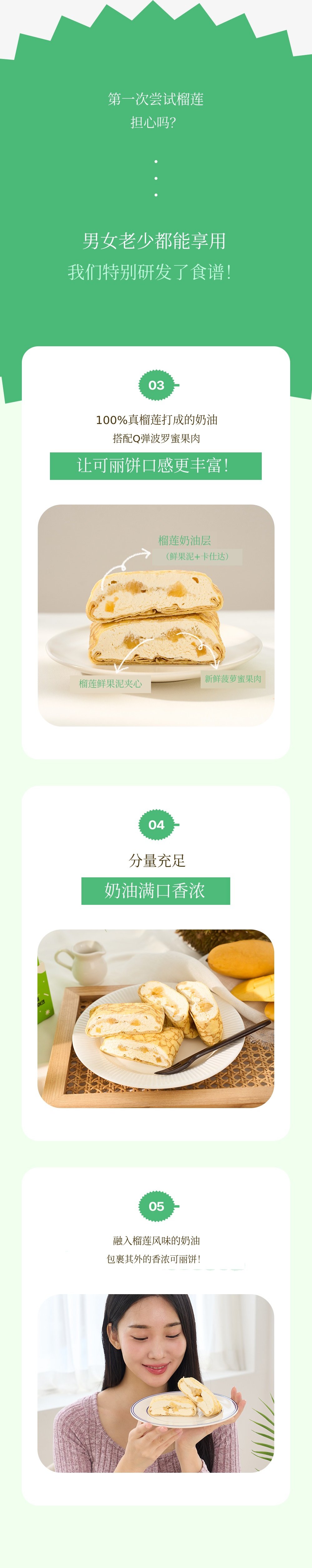 1. 🍰 榴莲芒果口袋可丽饼 - 采用真热带水果,口感新鲜柔软的甜点 2. 🌴 东南亚旅行体验 - 甜美热带水果味道,重现异国风情甜点 3. 🎁 优惠套装福利 - 含冰袋和红豆面包,价格优惠