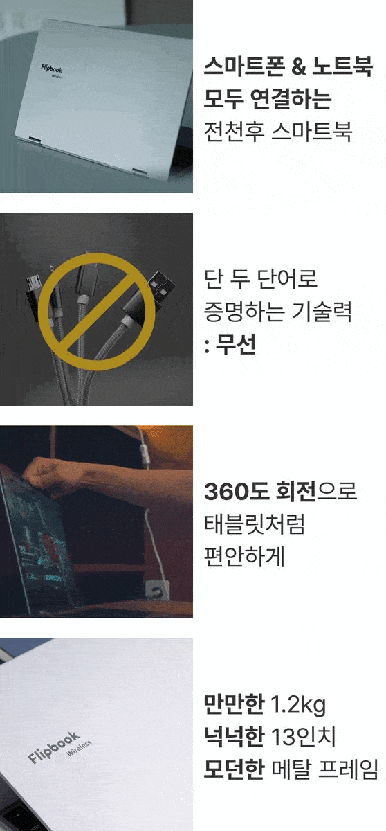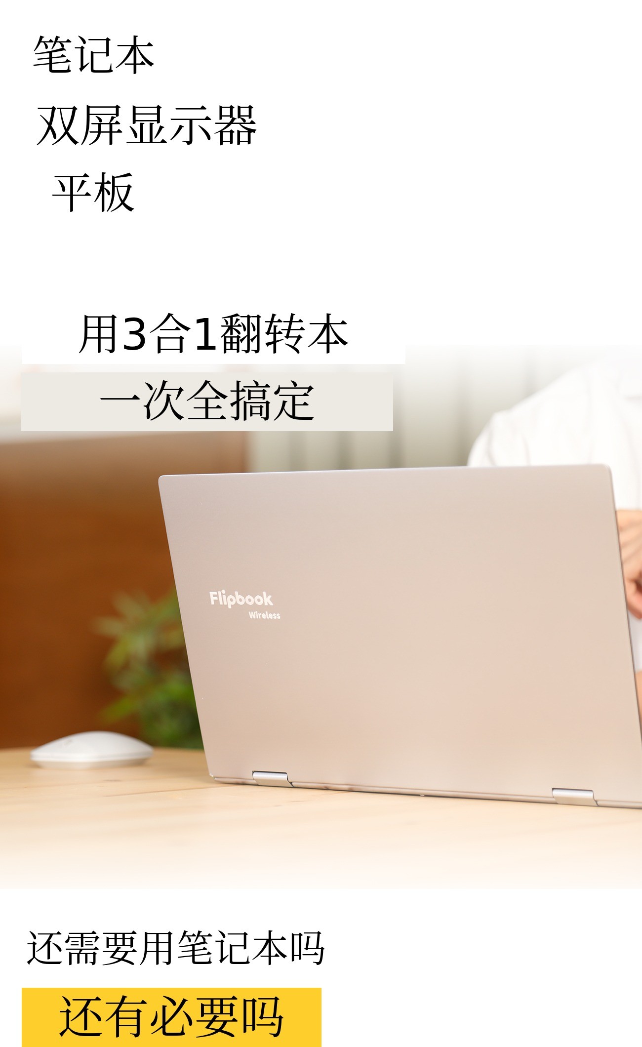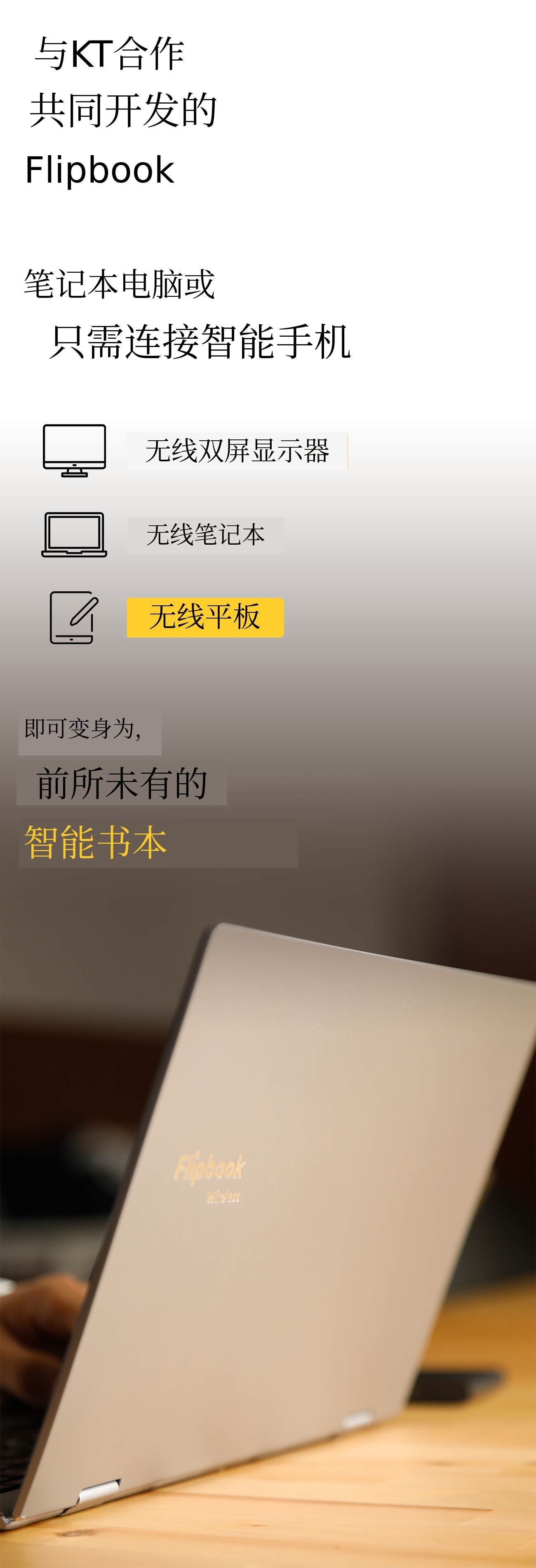 智能本也是一样。无线Flipbook支持与笔记本和智能手机的无线连接,有时像双屏显示器,有时像笔记本,有时像平板电脑,可以根据用户的需求自由切换。