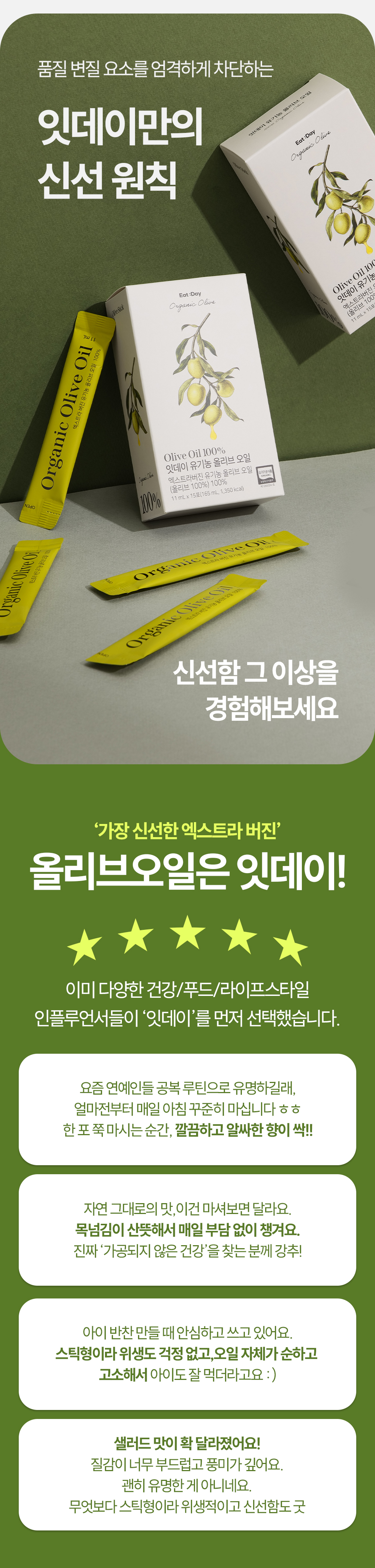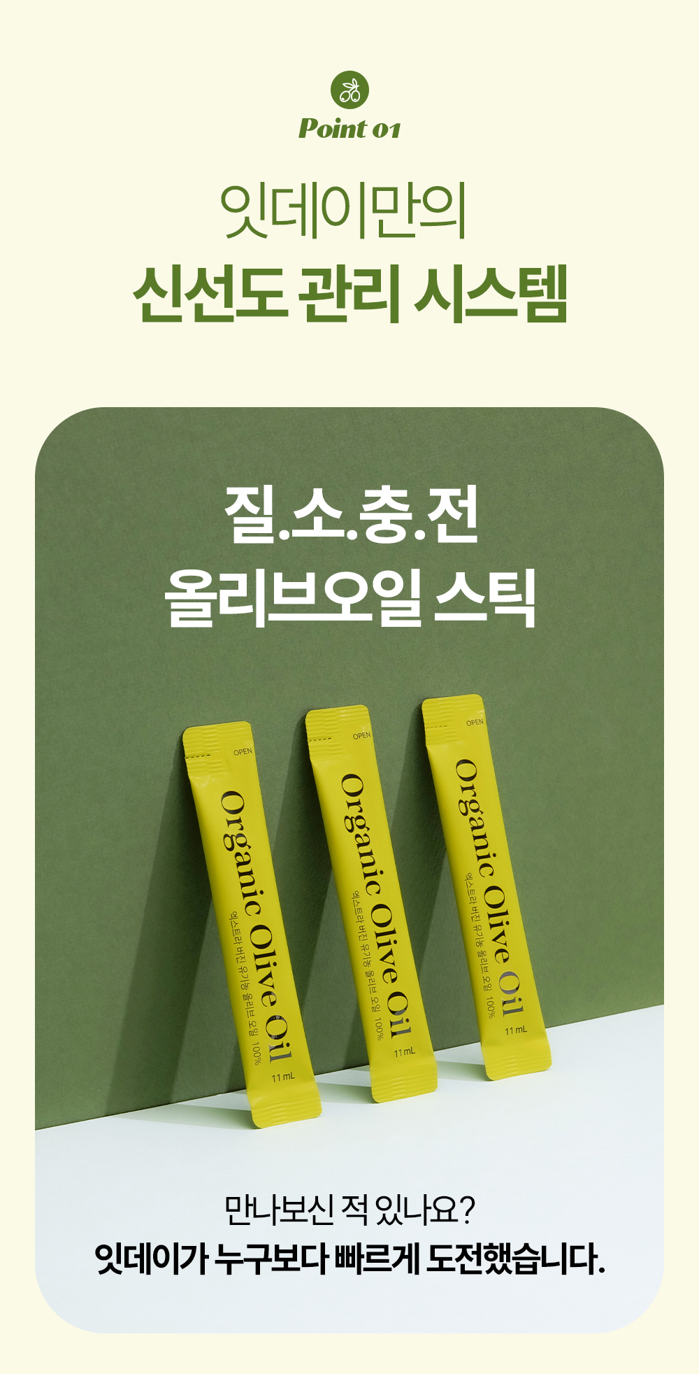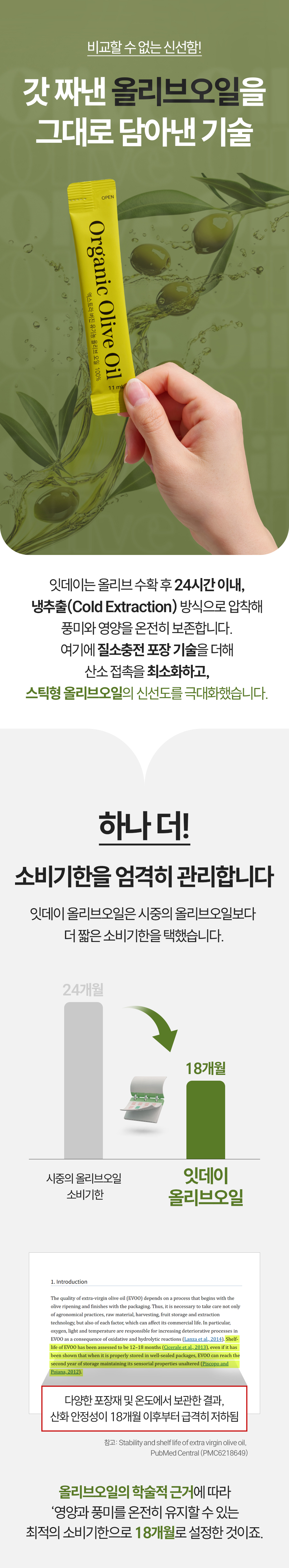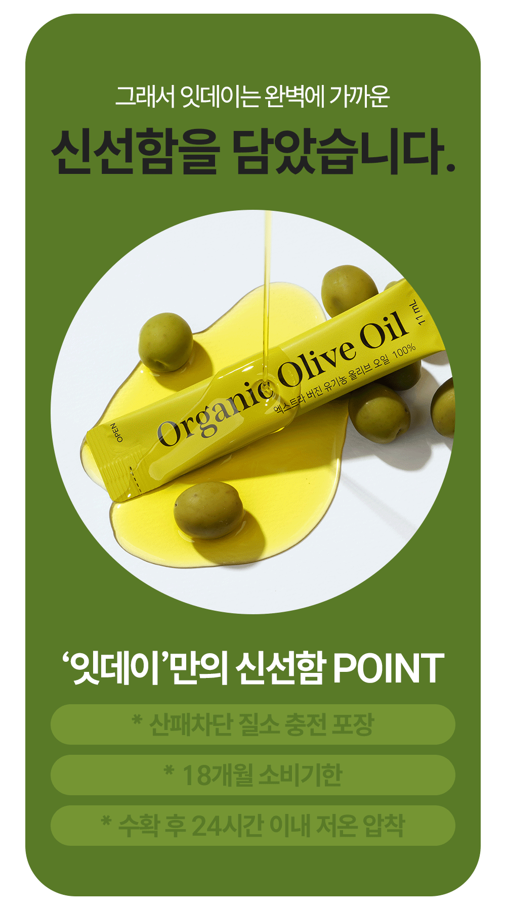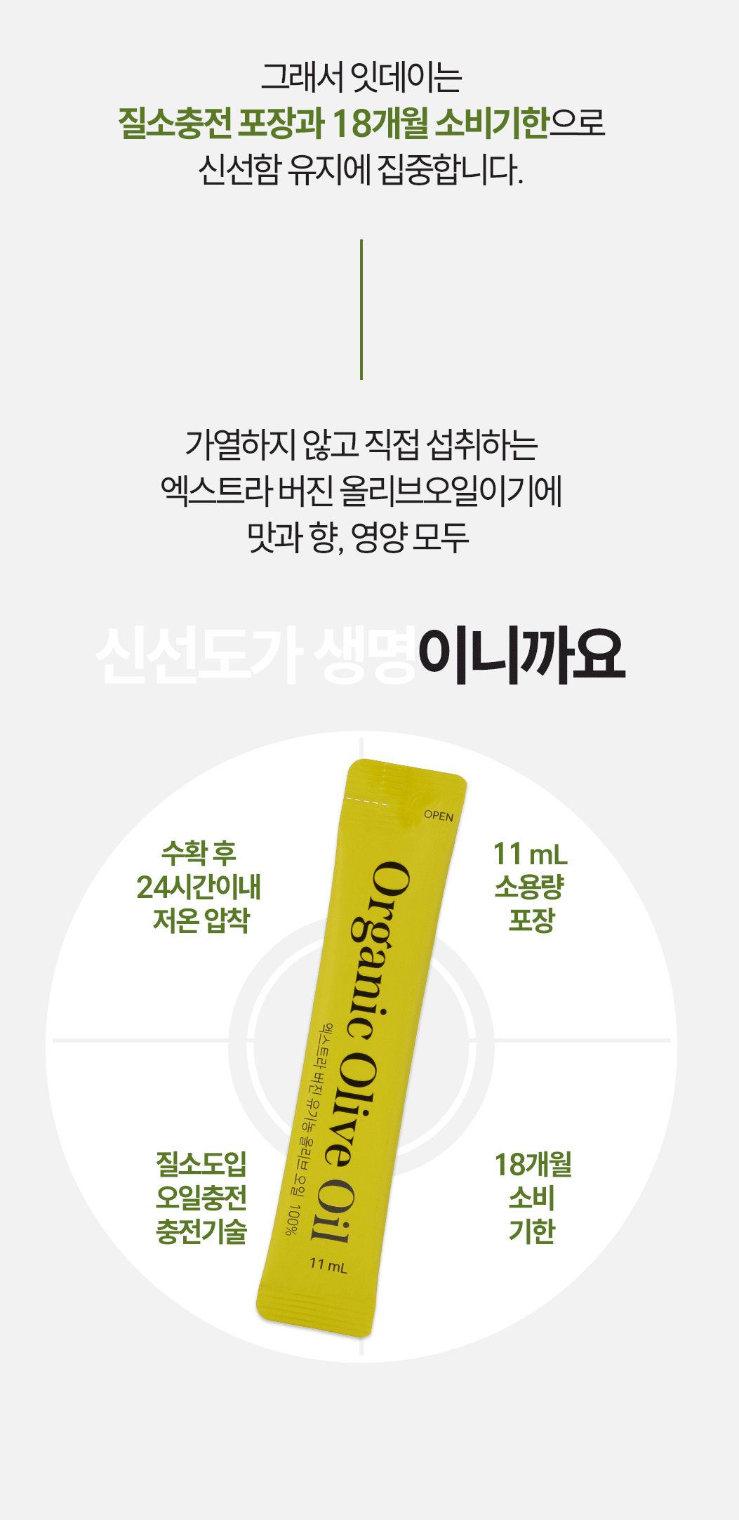 A. 공기 중에 노출된 올리브오일은 산패의 위험이 있으므로 특히 1회분씩 섭취할 수 있게 포장된 제품은 개봉하여 바로 소비하시는 것이 좋습니다.