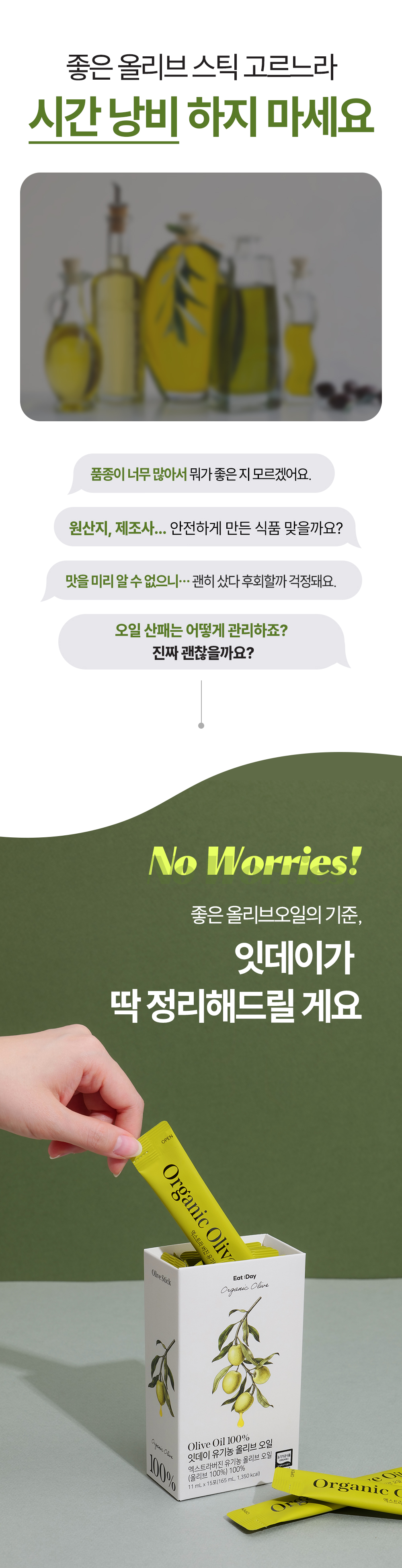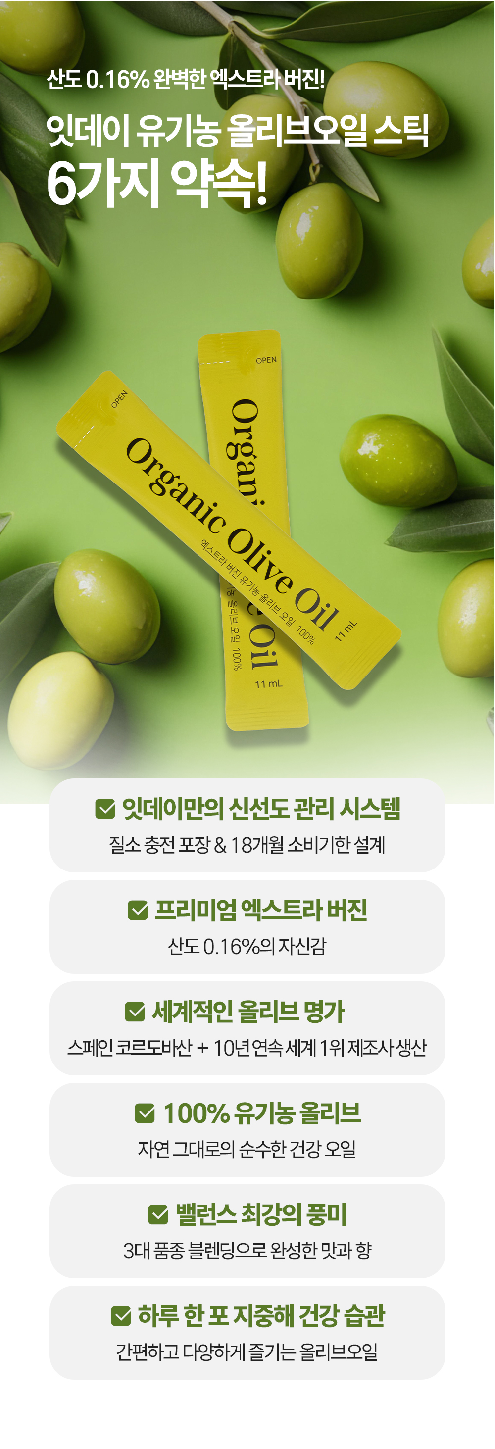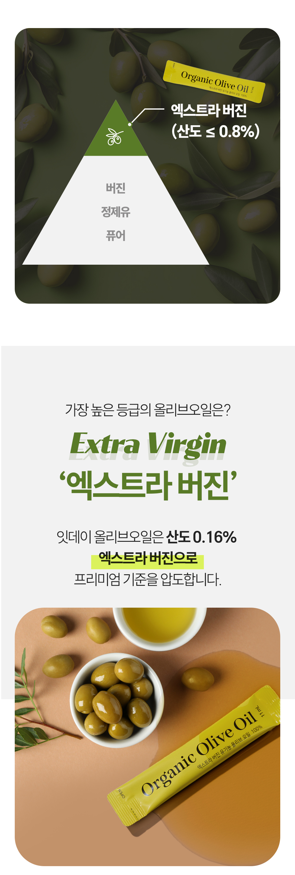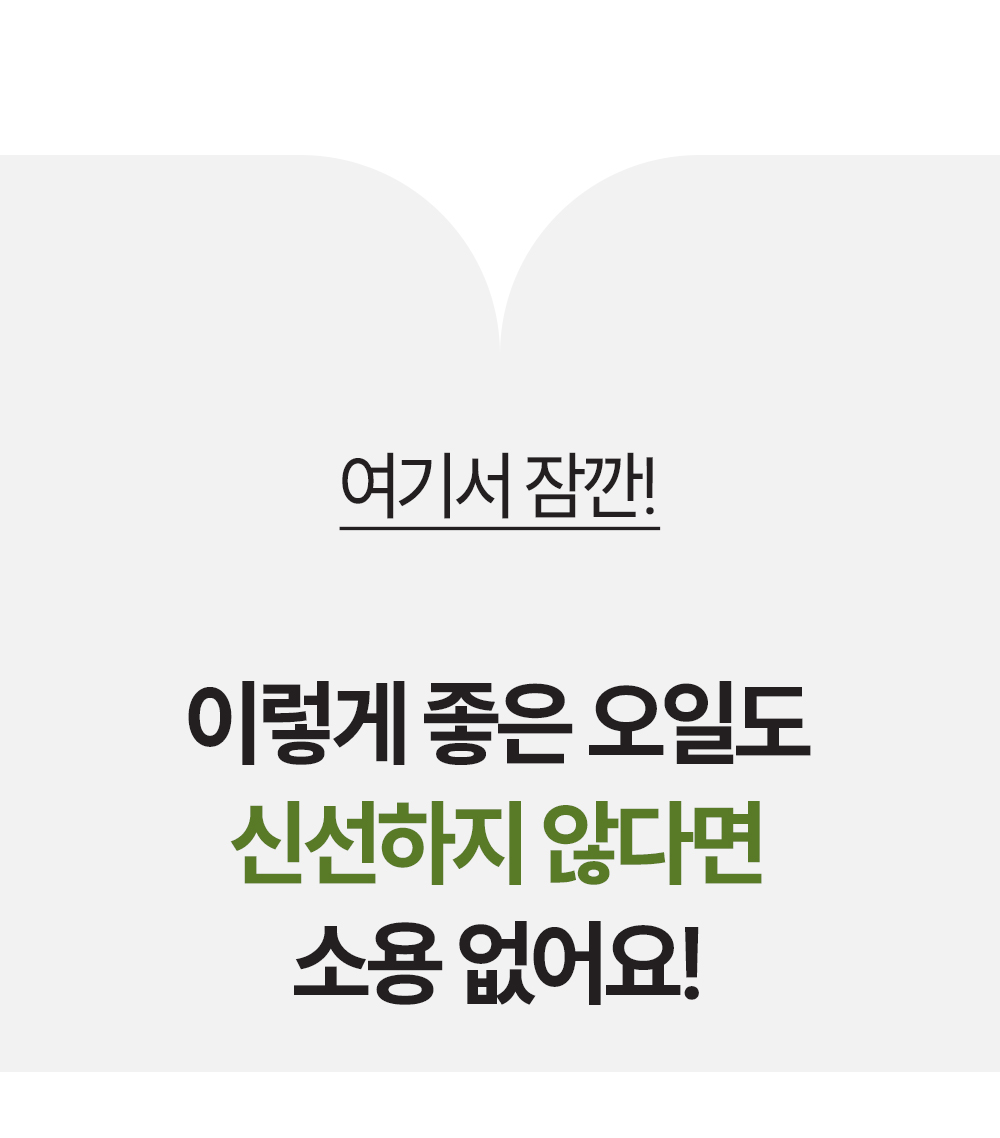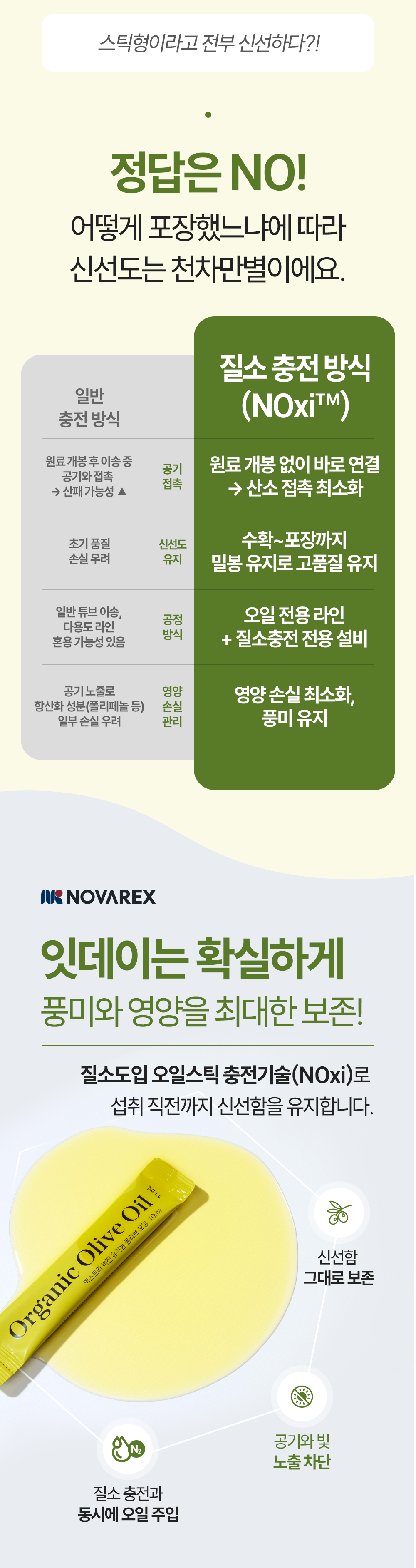 A. 공기 중에 노출된 올리브오일은 산패의 위험이 있으므로 특히 1회분씩 섭취할 수 있게 포장된 제품은 개봉하여 바로 소비하시는 것이 좋습니다.