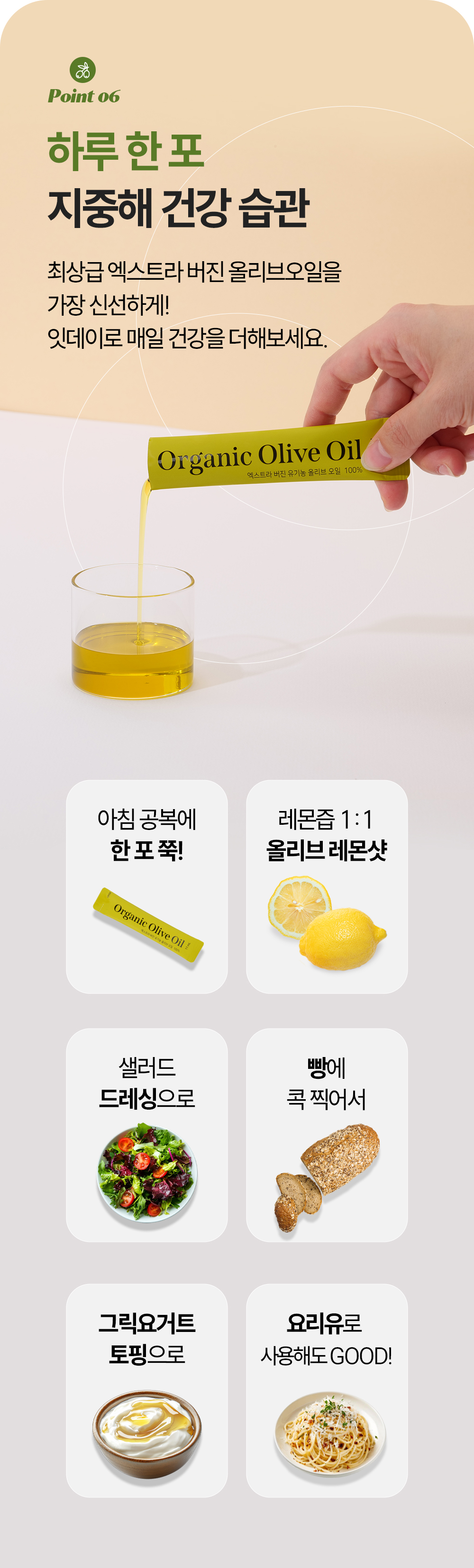 올리브유를 단순한 요리재료가 아닌, 건강을 위한 필수 루틴으로.