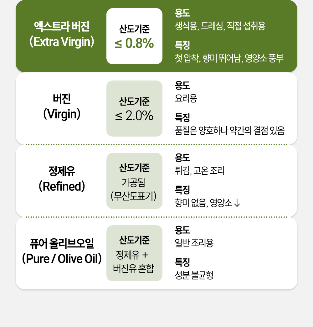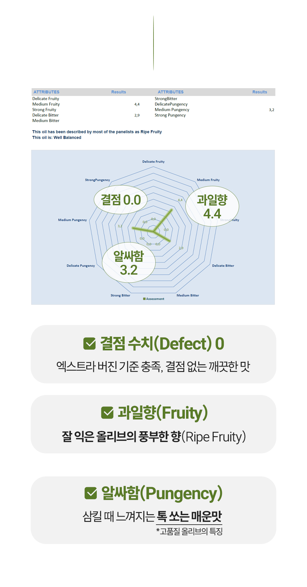A. 올리브유의 맛은 품종이나 수확 지역의 기후, 토양 등에 따라 달라집니다. 올리브유를 섭취할 때 목이 따끔거리거나 톡 쏘는 느낌, 또는 매운 느낌이 나는 이유는, **폴리페놀(phenolic compounds)**이라는 항산화 물질 때문인데 특히 **올레오칸탈(oleocanthal)이라는 성분이 주요 원인으로 신선하고 품질 좋은 올리브유의 특징입니다.