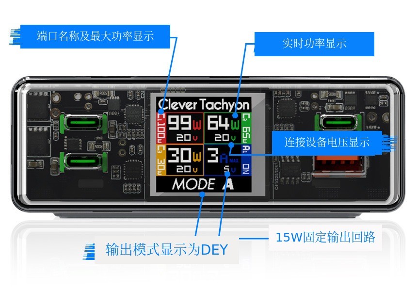 Clever Tachyon采用可见内部的赛博朋克设计 进行设计。前面板布满电路和各种电子元件,仅仅观看也能带来乐趣。内置的数字彩色显示屏会显示各端口的充电瓦数和电压,可以确认是否适合所连接设备的充电规格,实时确认。