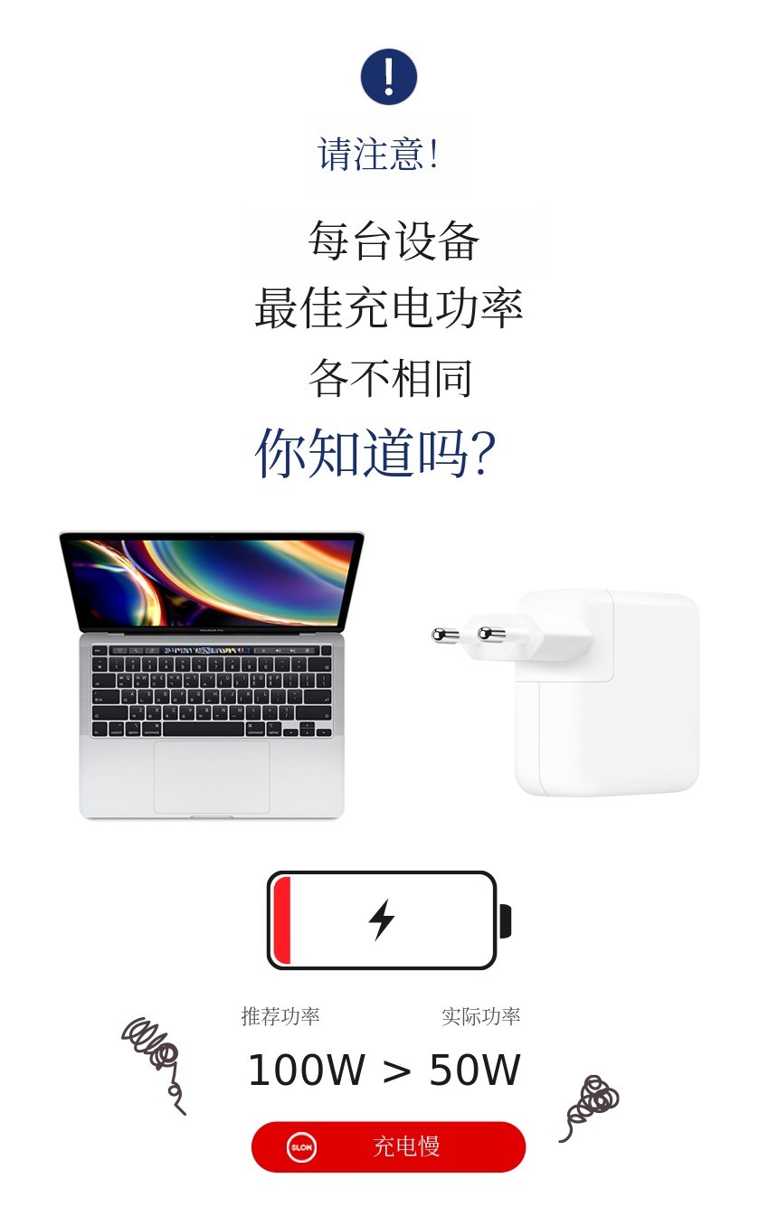 每种设备支持的充电功率都不同。如果使用与之不匹配的充电器,充电速度会非常慢,设备使用和移动时会带来很多不便。