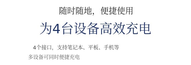 通过3个USB-C PD3.0端口和USB-A端口,可同时方便地为4台设备充电。USB-C支持 PPS、APPLE 5V 2.4A、QC3.0、QC4.0+、AFC、SCP、FCP、MTK PE等多种充电协议,提供出色的兼容性。