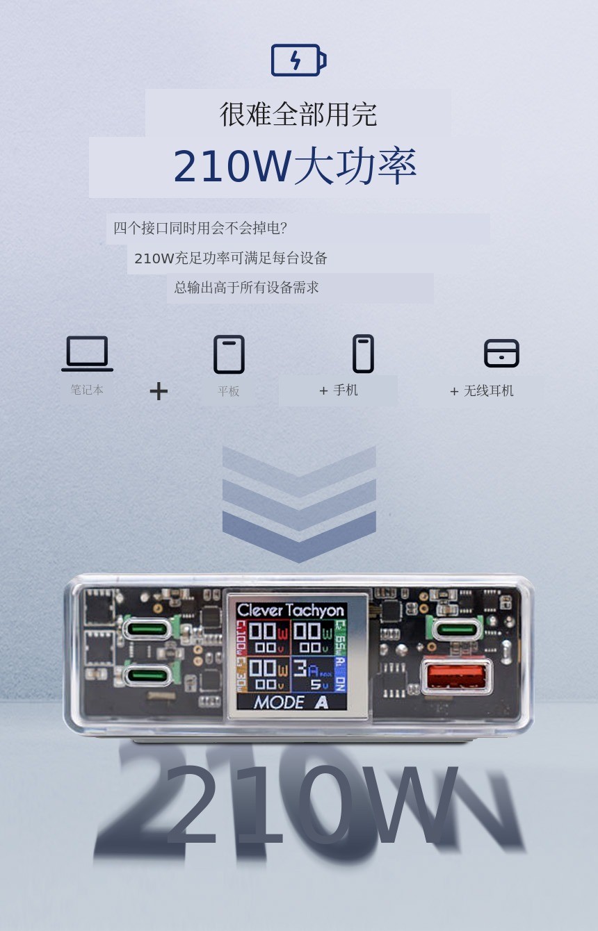 高性能笔记本、平板、智能手机、耳机等即使同时为多台设备充电也毫无压力的怪兽级输出210W