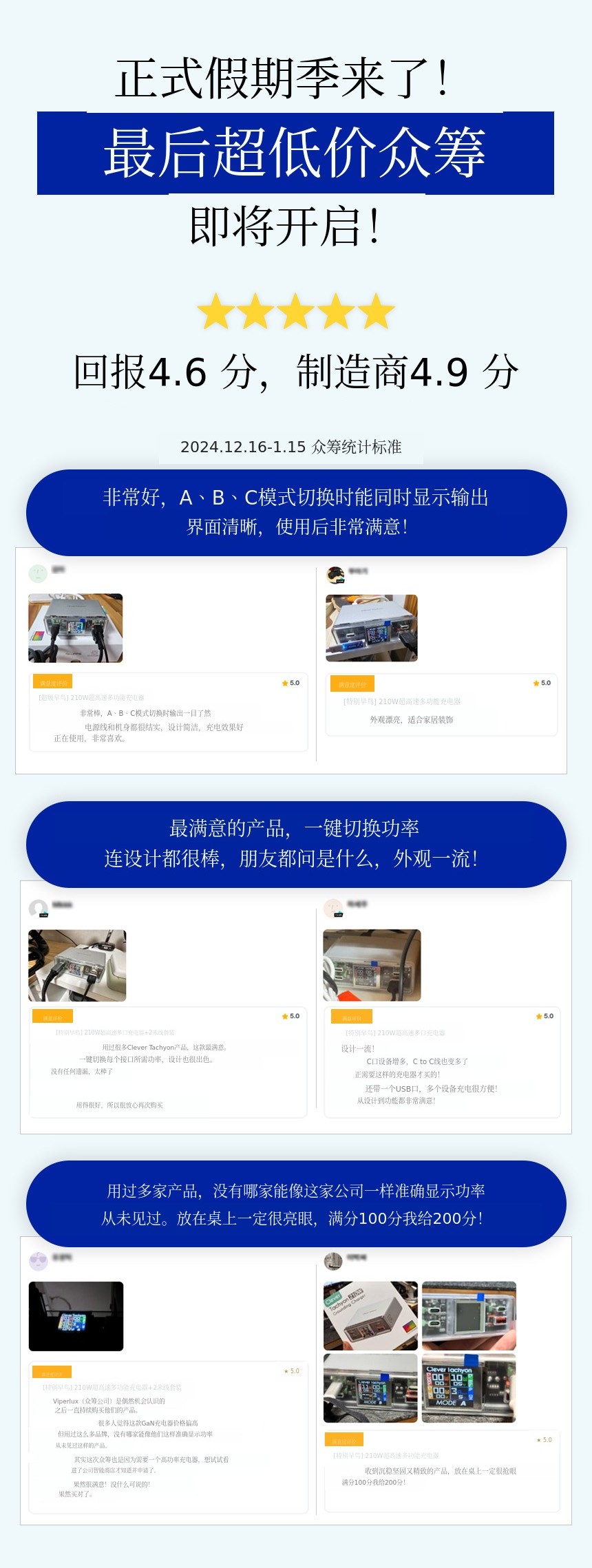 A. 市面上的多口充电器在多台设备充电时,由于各端口的电力分配,会出现充电瞬间停止后再次进行的类似重启现象。本众筹产品采用AI智能输出设计,不会出现此类重启现象,切换模式时也不会发生重启。