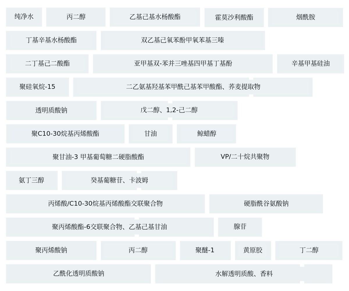 含有美白功能性成分烟酰胺 和改善皱纹的成分腺苷,具备防紫外线、美白、改善皱纹三重功能性。