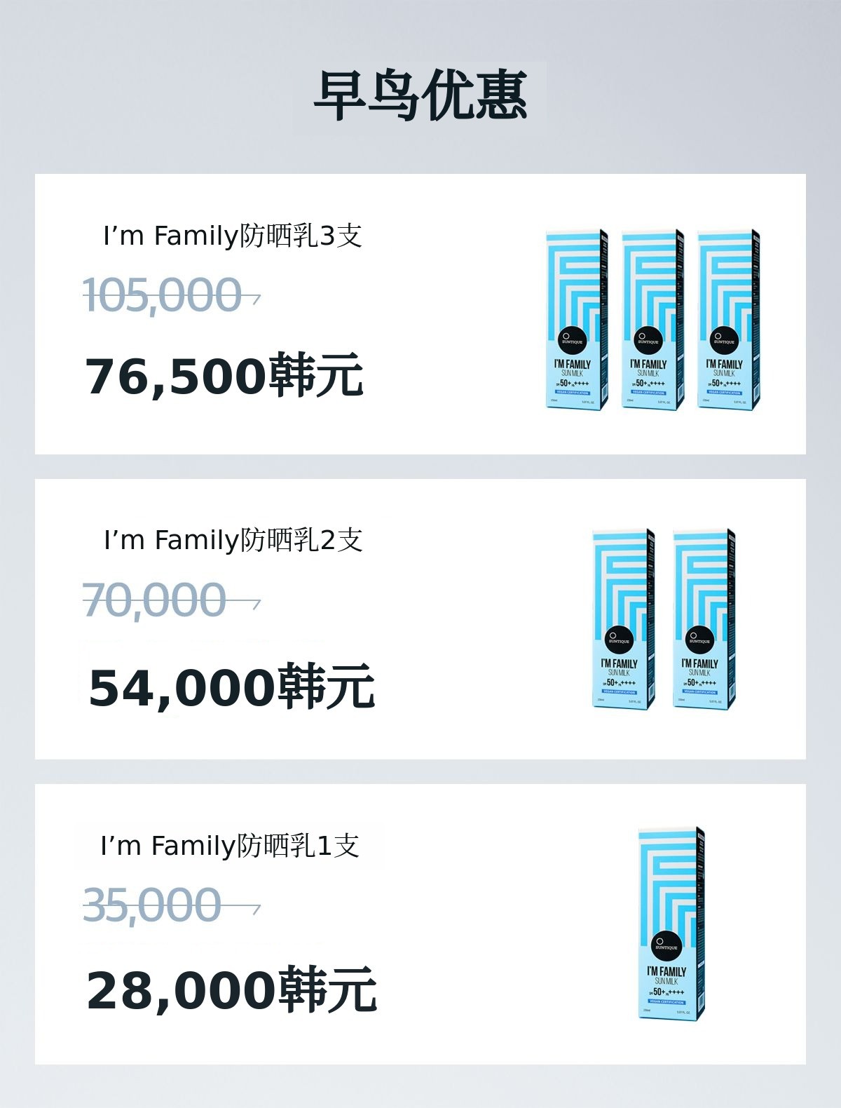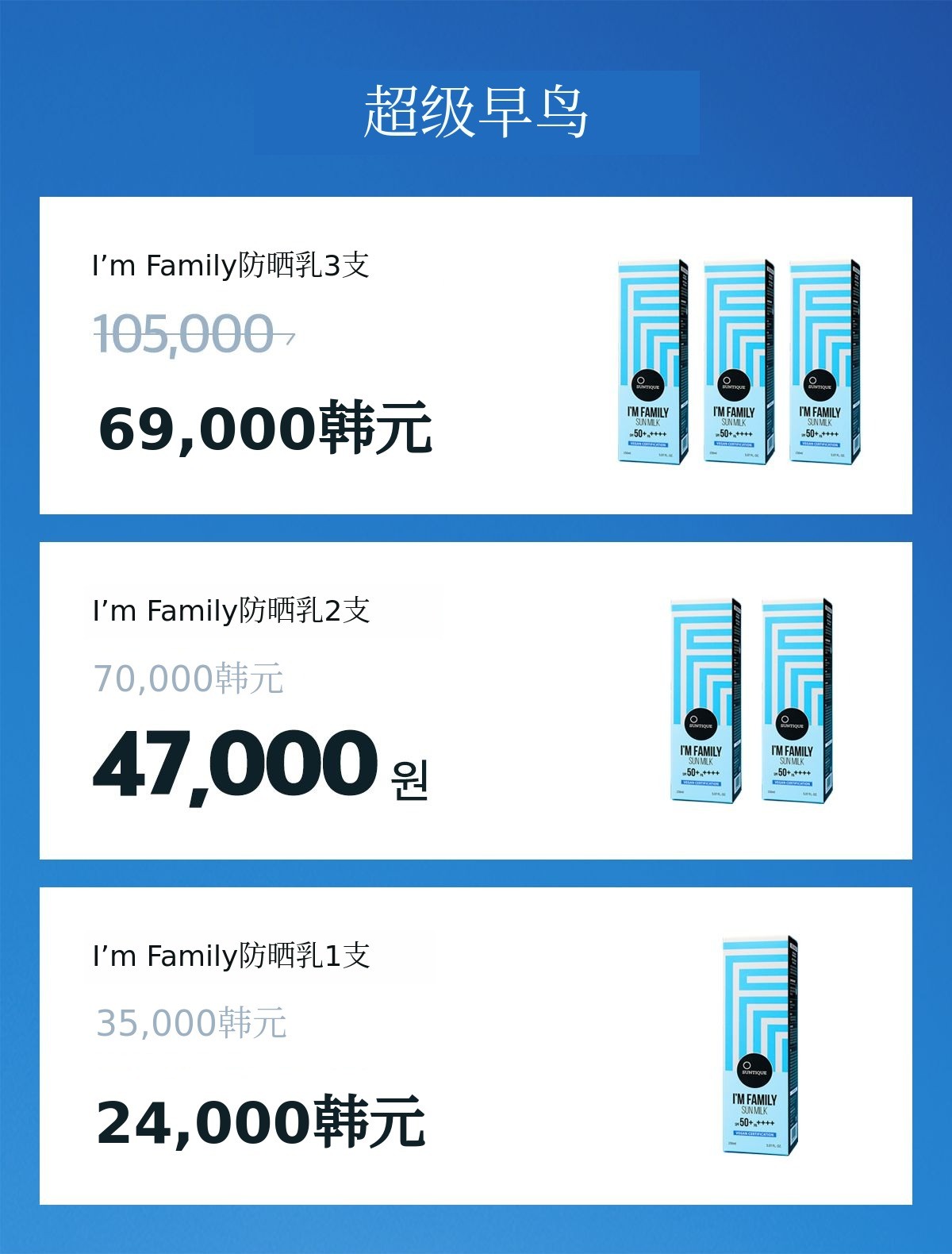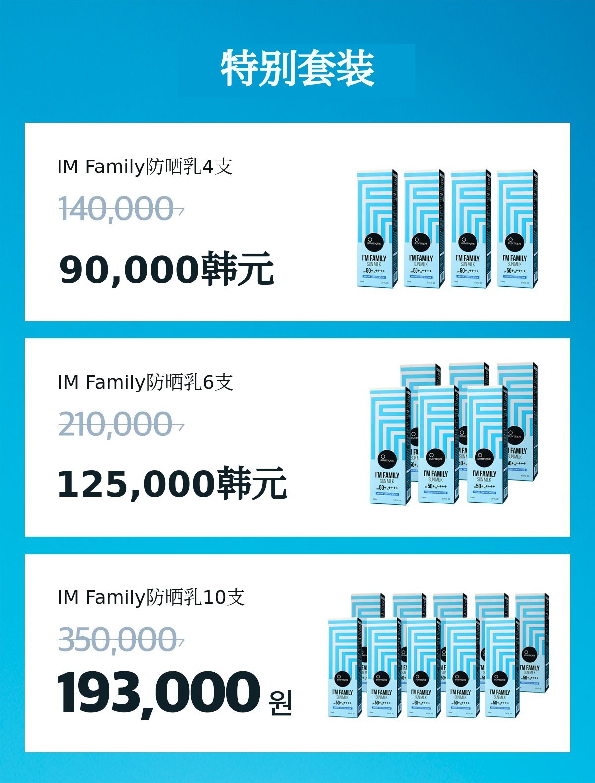 I’m Family防晒乳以[特别套装]为基准 90,000韩元 即可4支 可以参与众筹。