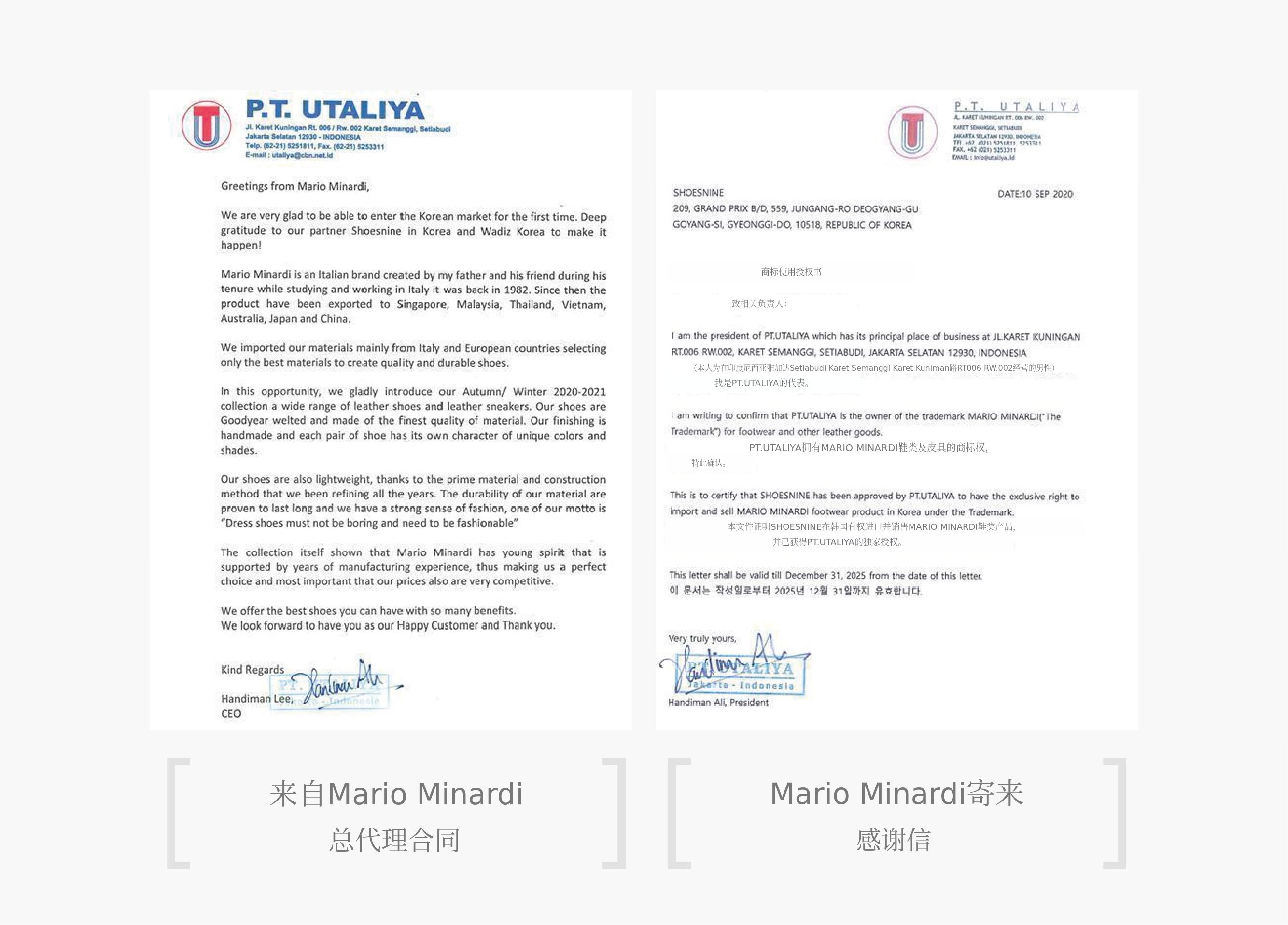 我们与MARIO MINARDI公司签订了独家合同,开发并应用适合韩国人脚型的鞋楦,于2017年6月成立,旨在提供兼具时尚设计与舒适穿着感的高端手工鞋。与总部的合作关系良好,建立了信任,成功在国内共同注册了Mario Minardi商标。
