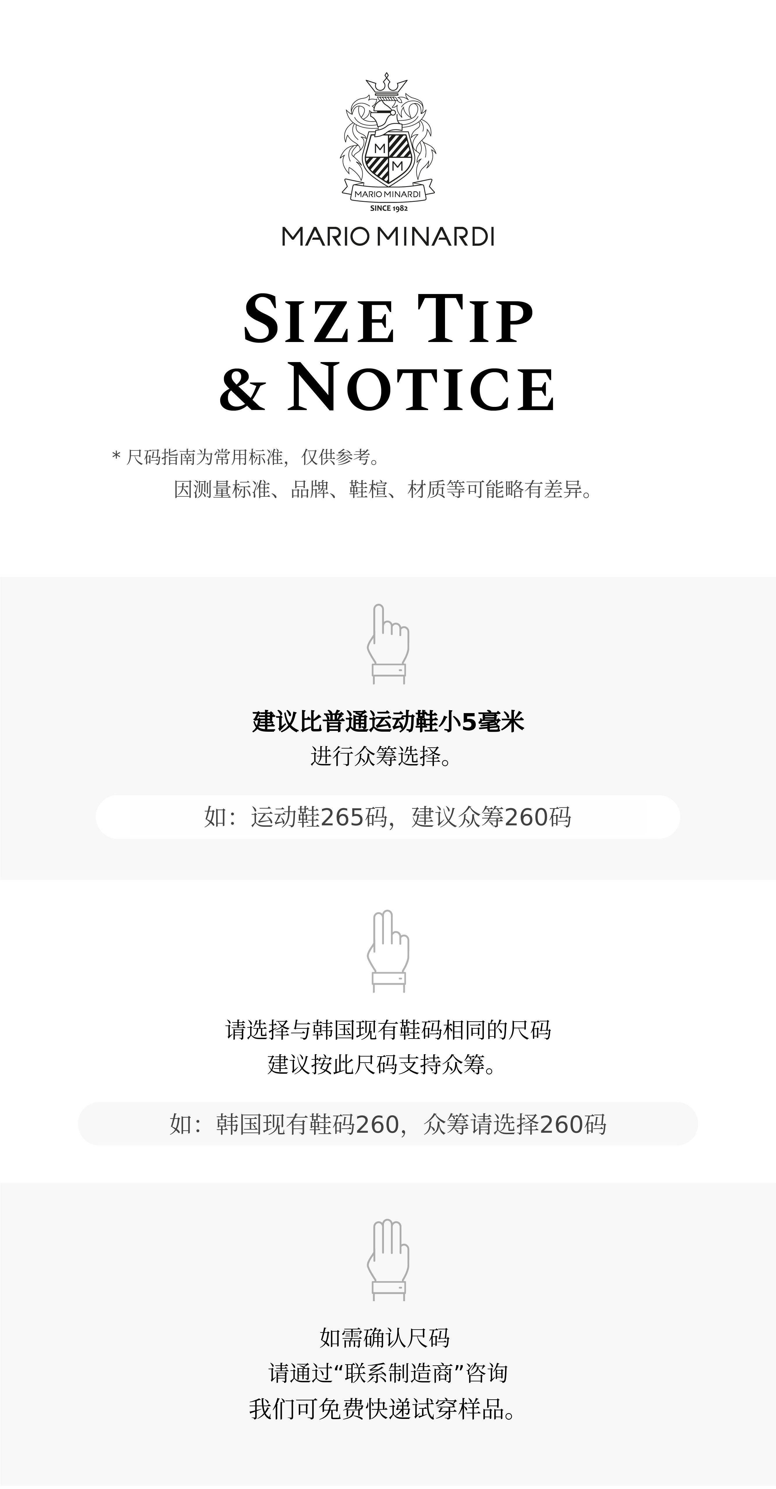 虽然备有部分换货准备库存,但数量有限,可能会出现无法立即换货的情况。如果您是首次参与马里奥米纳尔迪奖励众筹并需要确认尺码,我们可以免费寄送可确认马里奥米纳尔迪尺码的试穿样品。 试穿样品的申请也请通过上方的KakaoTalk频道马里奥米纳尔迪进行。如果尺码不合适,马里奥米纳尔迪会尽最大努力从支持者的角度帮助您解决不便,如有任何不便请随时联系。(海外支持者不提供试穿样品服务)