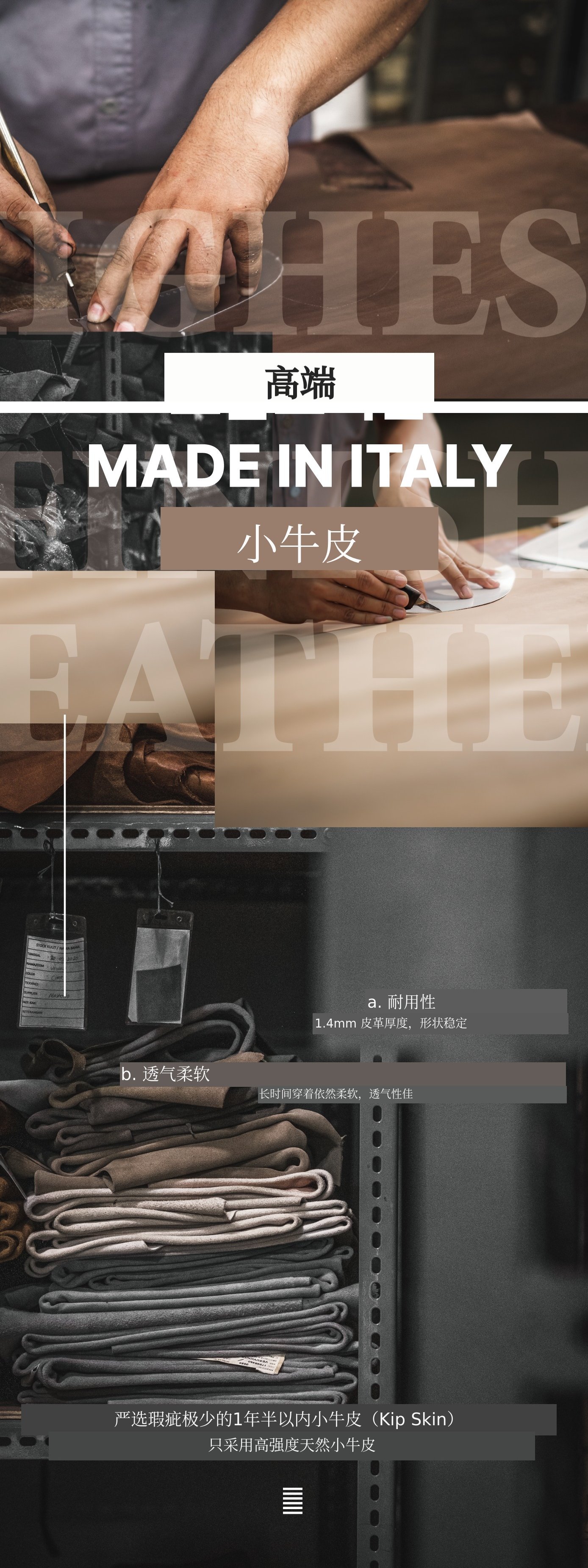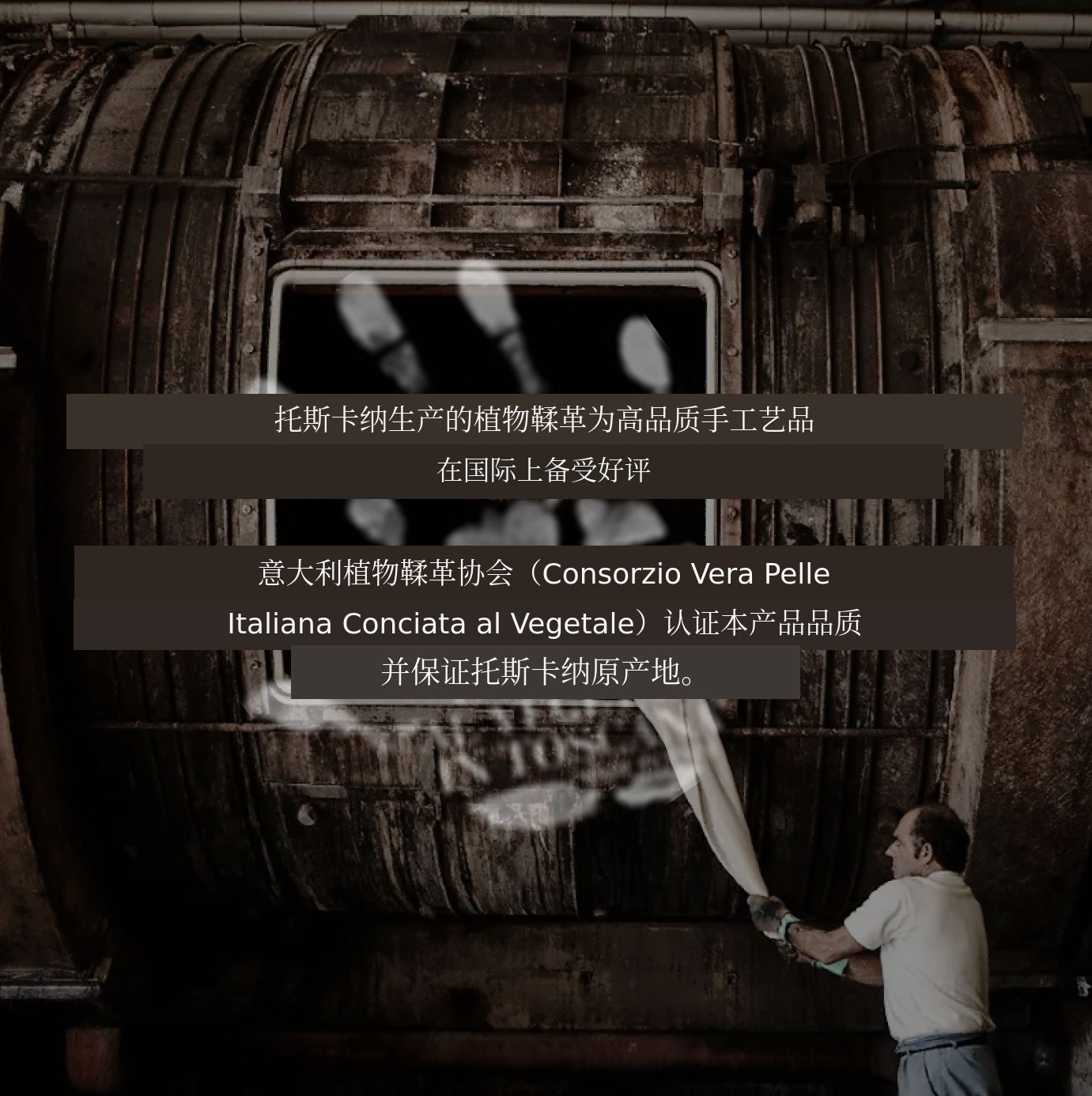 意大利托斯卡纳地区生产的植物鞣制小牛皮毛孔细小,伤痕少,拥有高贵且均匀的纹理。其简洁的表面能很好地吸收染料,展现出卓越的色彩表现力。适度的光泽感和柔软的触感 等Kip皮的优点数不胜数。