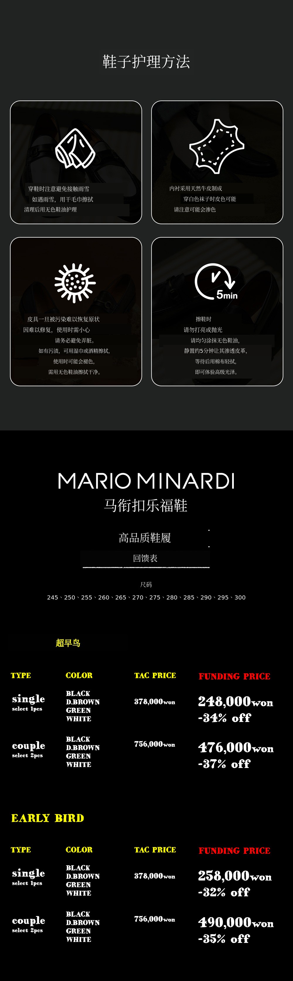 希望通过Wadiz让Mario Minardi被更多人知晓。许多支持者们以固特异沿条工艺为基础,通过Patina工艺展现出高级感外观 的MAIRO MINARDI 希望大家能与我们一起享受愉快的体验。通过支持者们的评价验证的舒适穿着感也是额外的收获。以合理的价格、时尚的风格以及经过验证的舒适穿着感的MARIO MINARDI 希望大家穿上它开启幸福的一天。筹集的资金将用于回报制作及下一个项目的新产品开发费用。