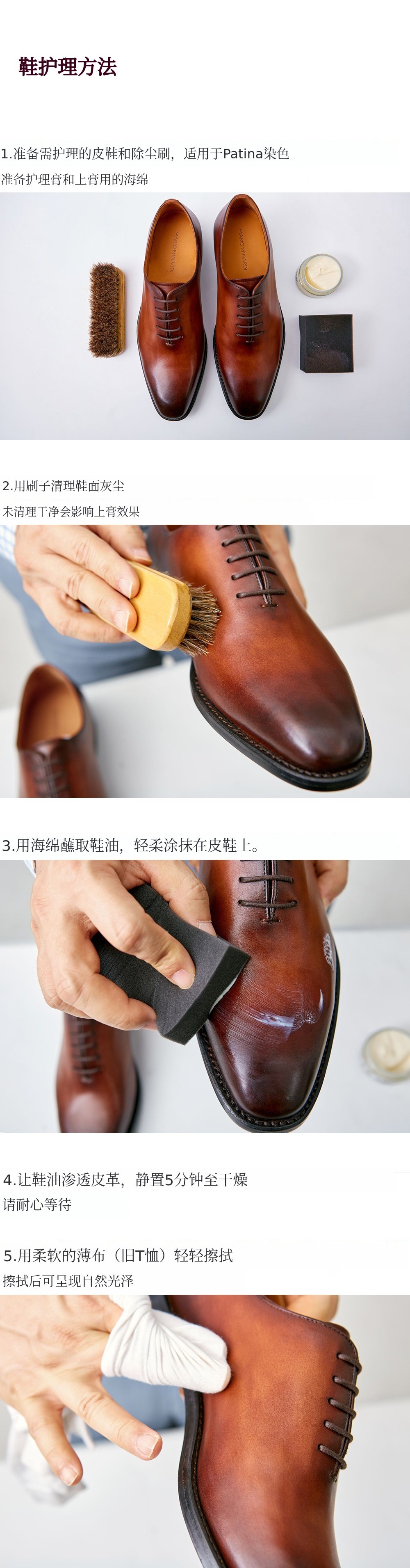 Patina色彩虽然高贵,但为了长久保持美丽的颜色,建议偶尔用鞋油进行护理。绝对禁止水光或火光处理. 像军队战斗靴一样 只有在皮革表面状况不好,需要全部打磨并进行强力涂层的低价皮革上,水光或火光才适合。 建议用无色鞋油轻轻擦拭巴蒂纳皮鞋。