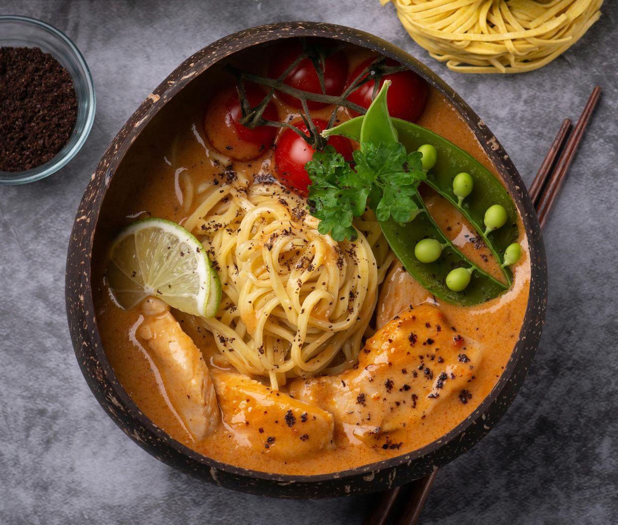 咖喱酱、椰奶、鸡蛋、面粉、辣椒、大蒜、洋葱、盐、香菜、牛肉、鸡胸肉、鱿鱼、青口、虾、肉豆蔻、姜黄、青柠、香茅、柠檬、鱼露、糖、胡椒