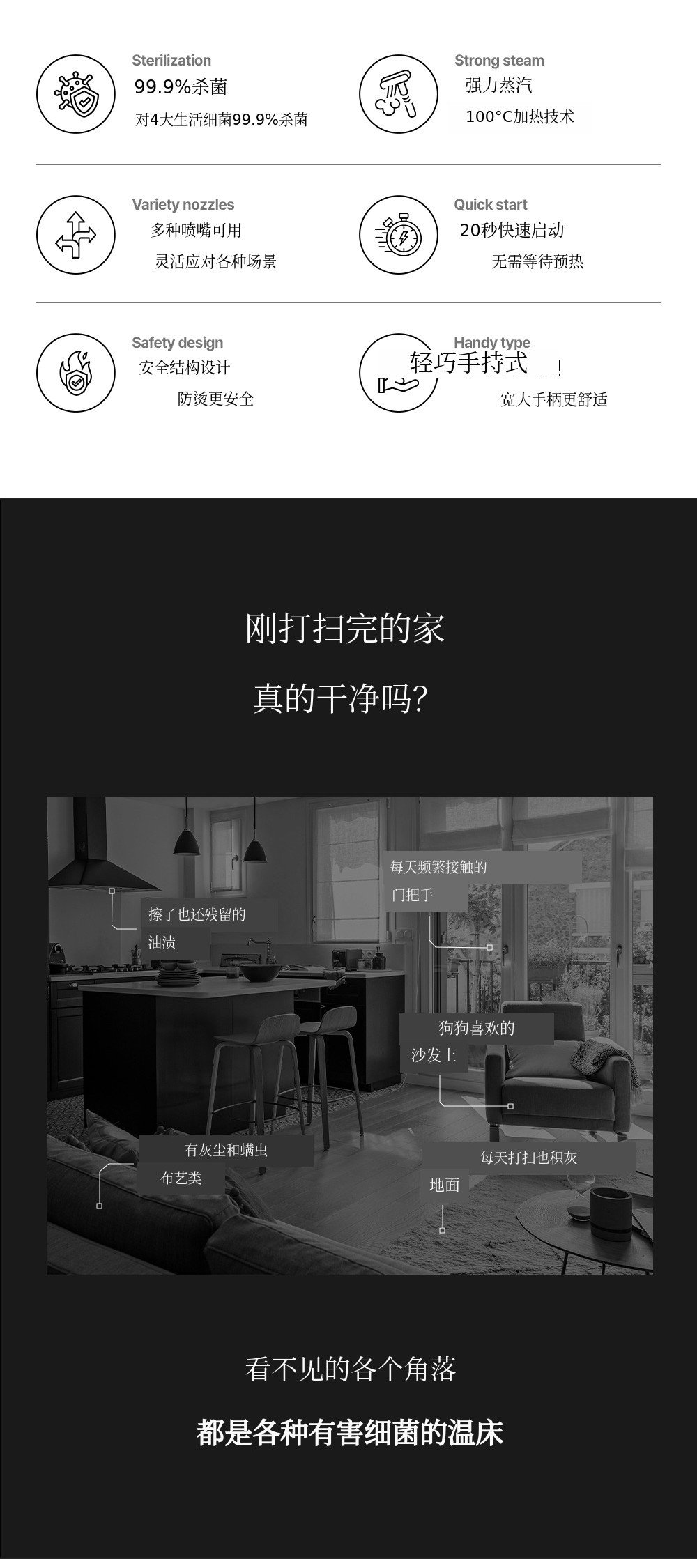 用高温蒸汽,一次性清洁地面和细菌!