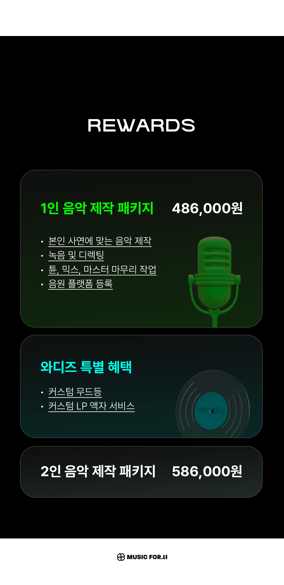 뮤직포유는 고객의 소중한 순간을 음악으로 기록하는 맞춤형 음악 제작 서비스를 제공하기 위해 와디즈를 찾아왔습니다.