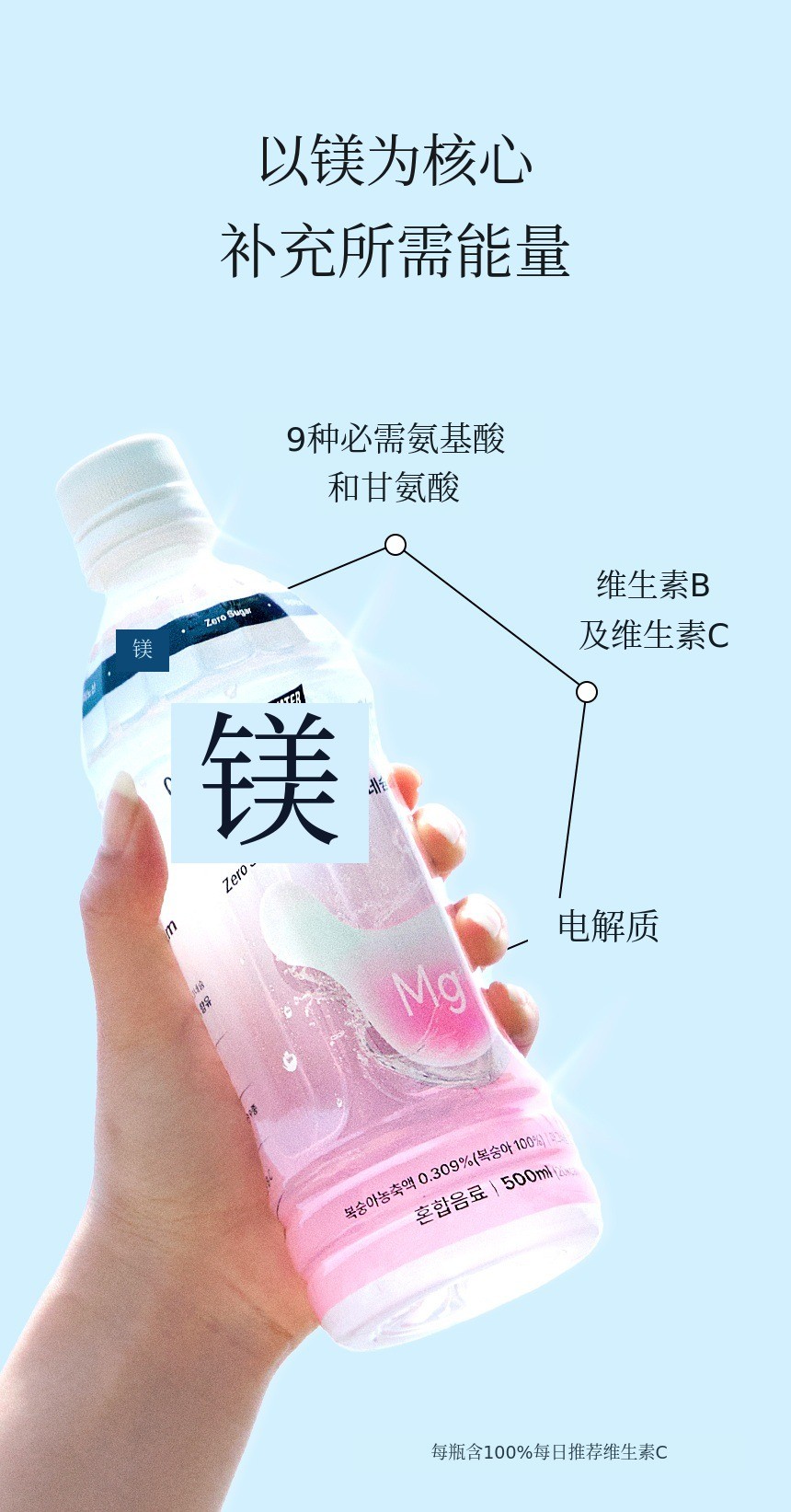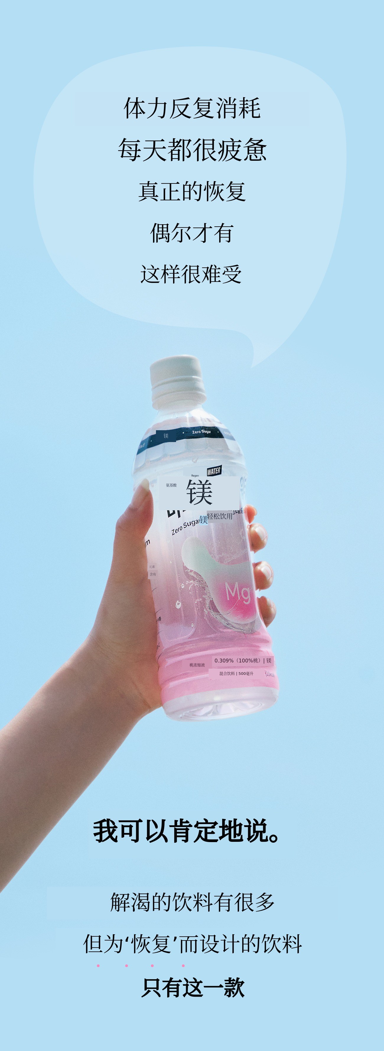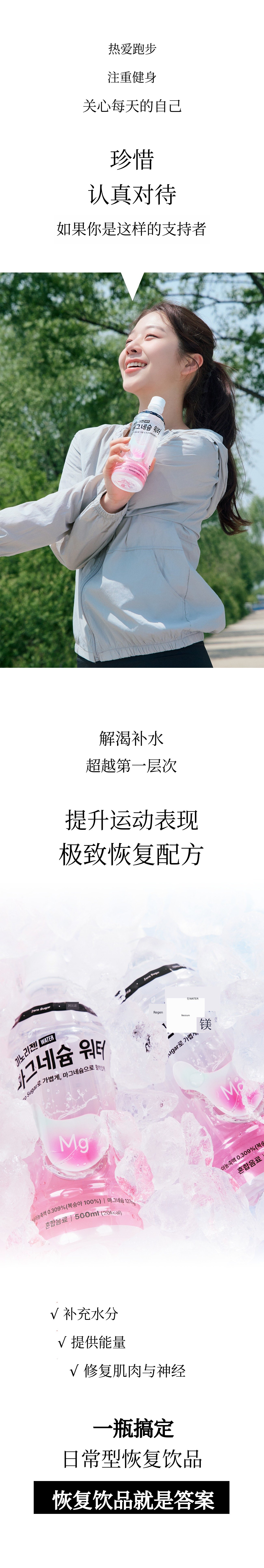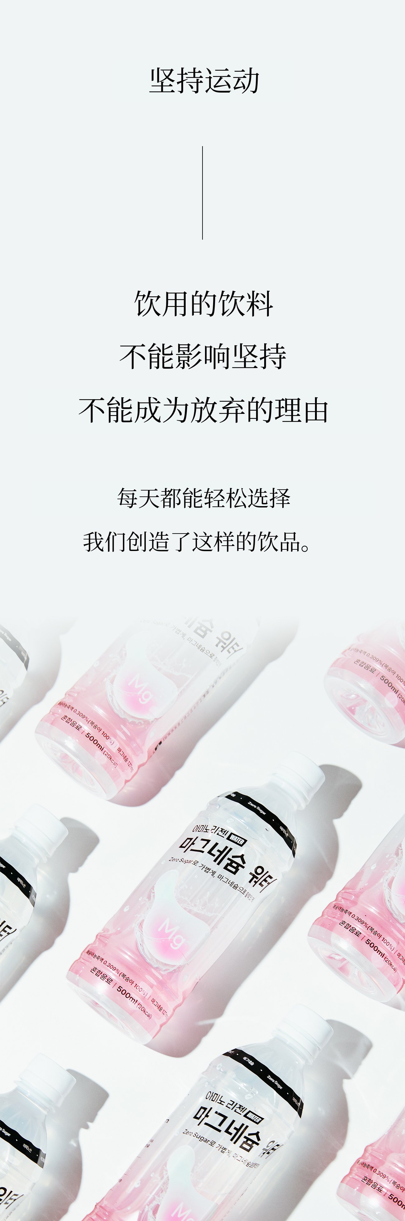 如果说以往的镁产品以药片、粉末和沉重的功能性为主,镁水则是一款符合现代人生活方式的“饮品型健康产品”。我们策划这款产品,是为了让其在睡眠、压力、运动后疲劳恢复等所有需要恢复的时刻都能自然融入您的生活。