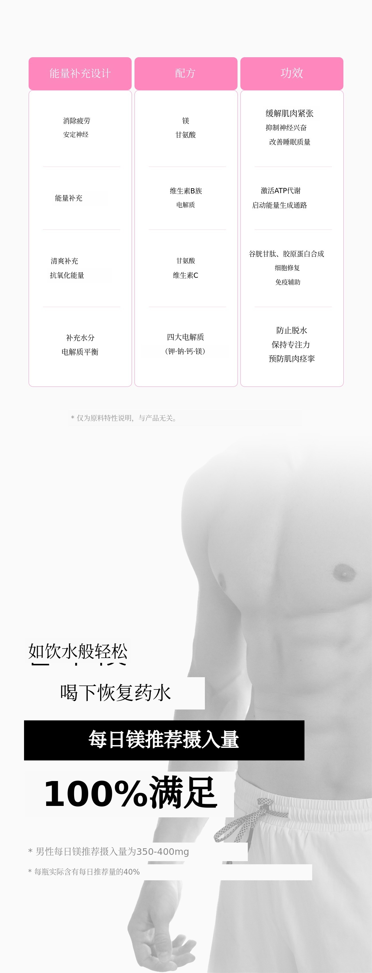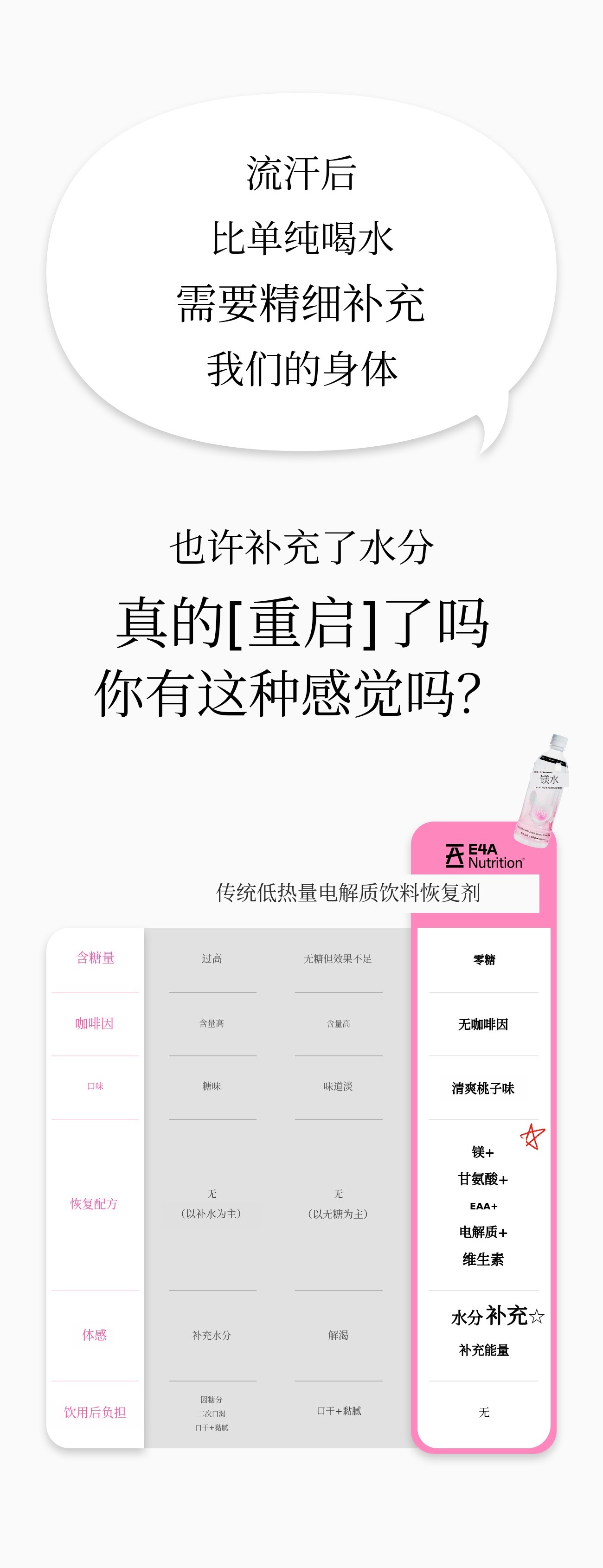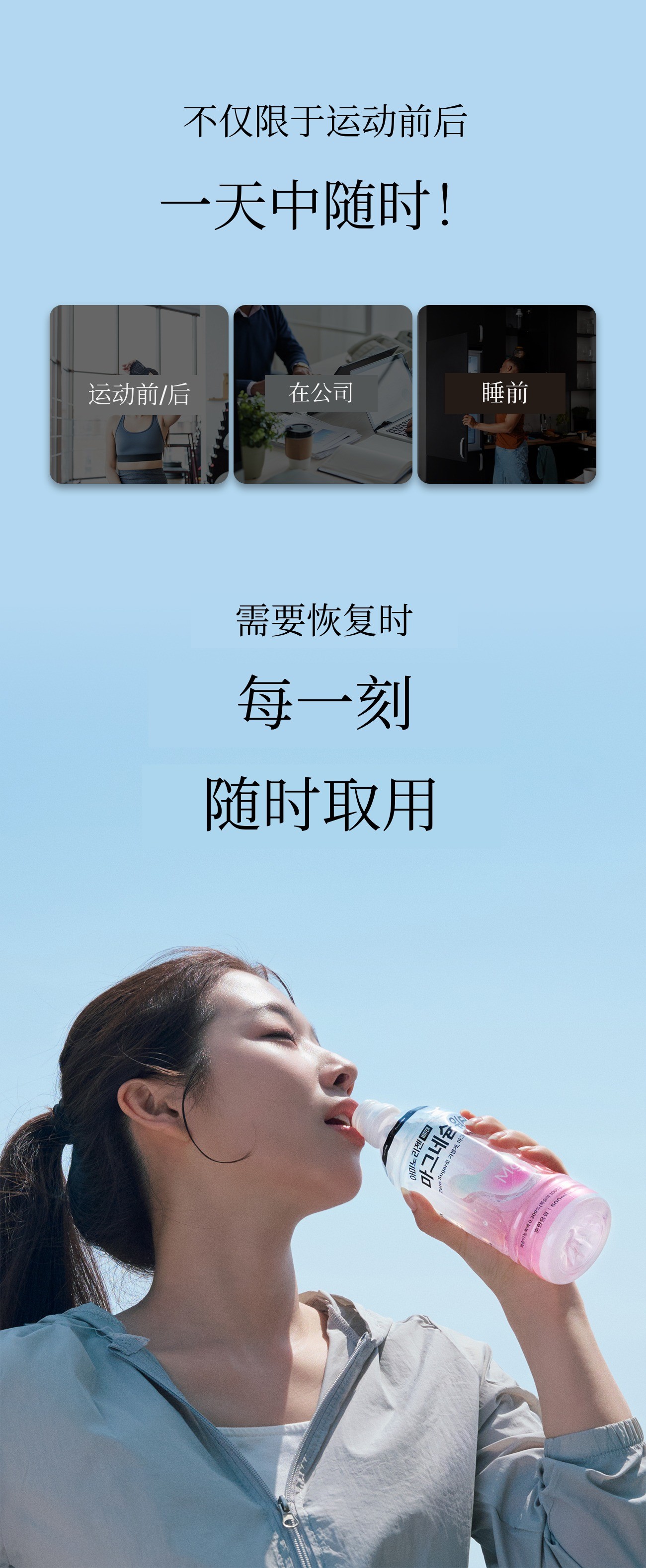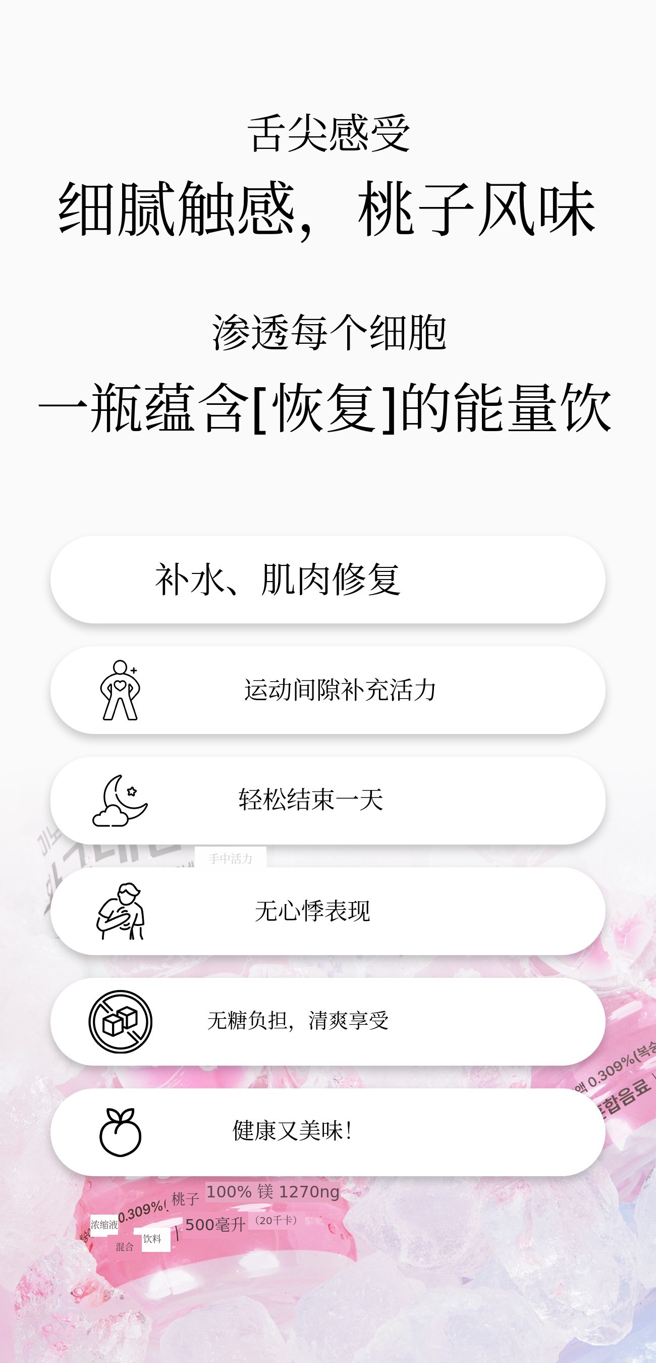 如果说以往的镁产品以药片、粉末和沉重的功能性为主,镁水则是一款符合现代人生活方式的“饮品型健康产品”。我们策划这款产品,是为了让其在睡眠、压力、运动后疲劳恢复等所有需要恢复的时刻都能自然融入您的生活。