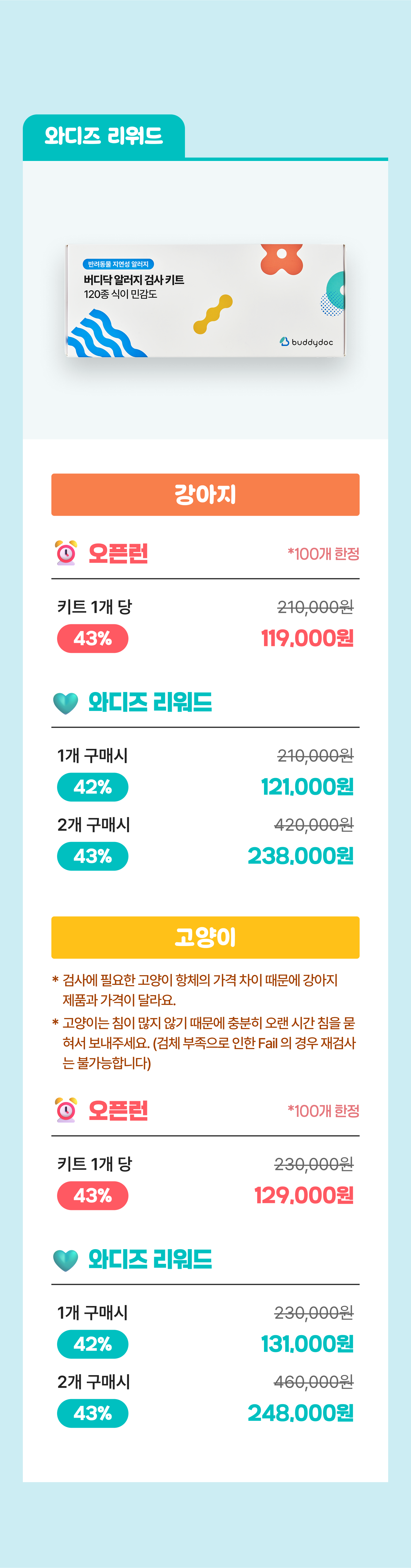 1. 🐾 120项宠物过敏检测套件 - 在家轻松检测120种食物敏感 2. 🔬 准确细致的检测结果 - 5级数值清晰展示检测结果 3. 🎁 独家众筹优惠 - 众筹平台享受折扣价格