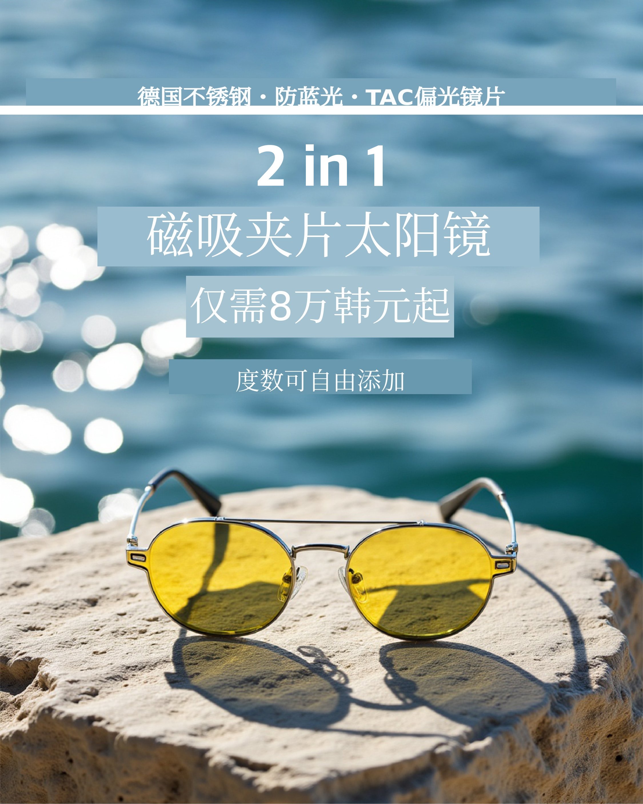 1. 🕶️ 2合1磁吸太阳镜 - 适合高度近视用户的磁吸夹片太阳镜 2. 👓 快速转换功能 - 室内眼镜1秒变身太阳镜 3. 🇩🇪 德国不锈钢材质 - 采用耐用的德国不锈钢框架