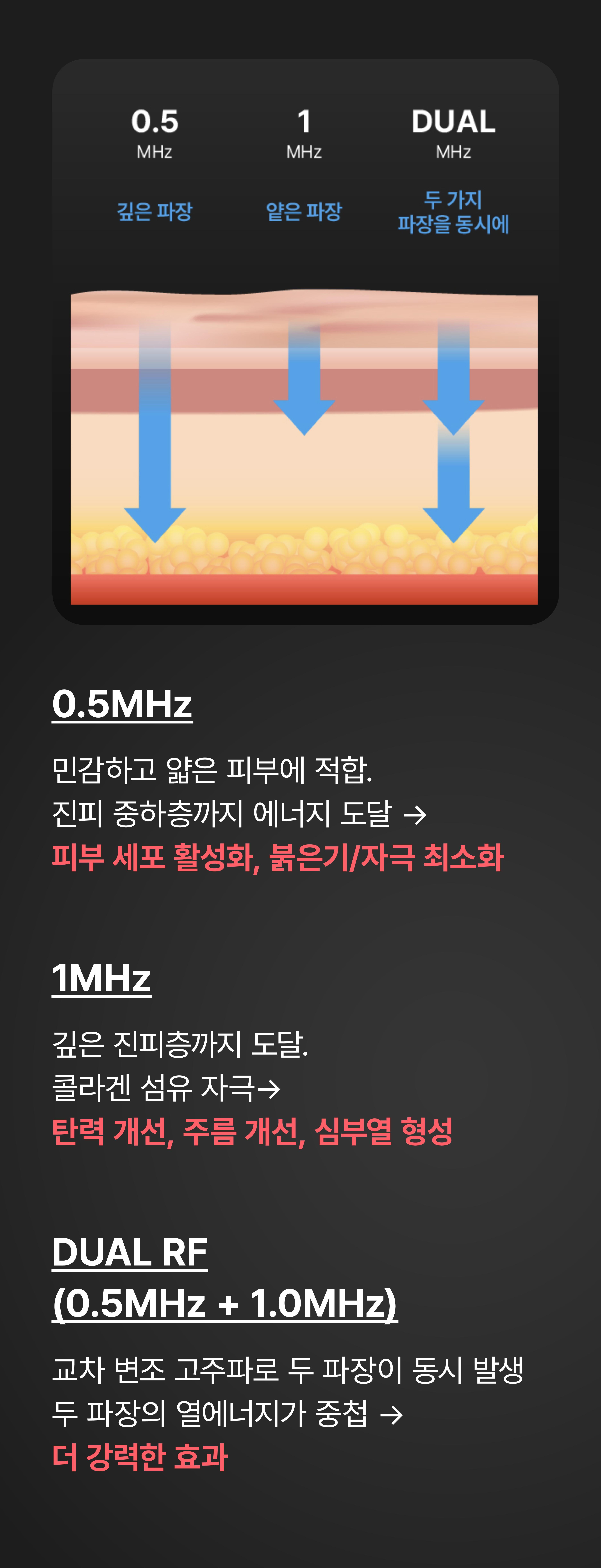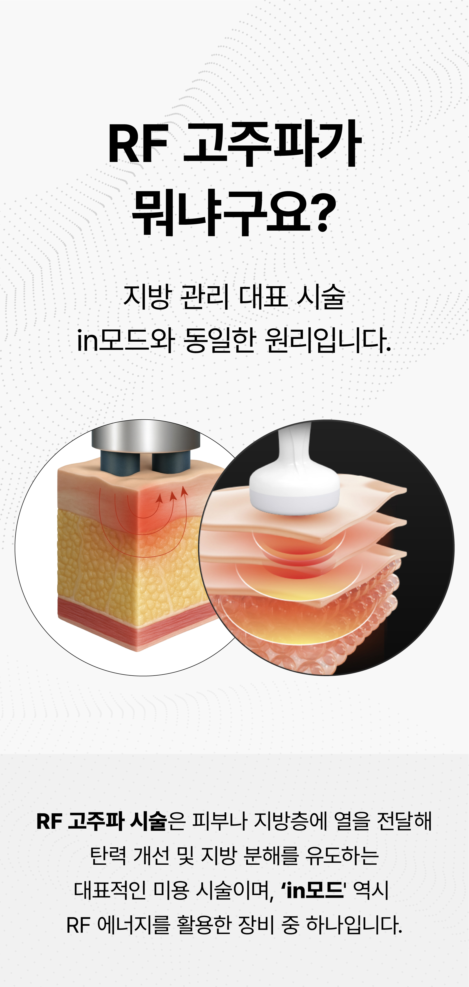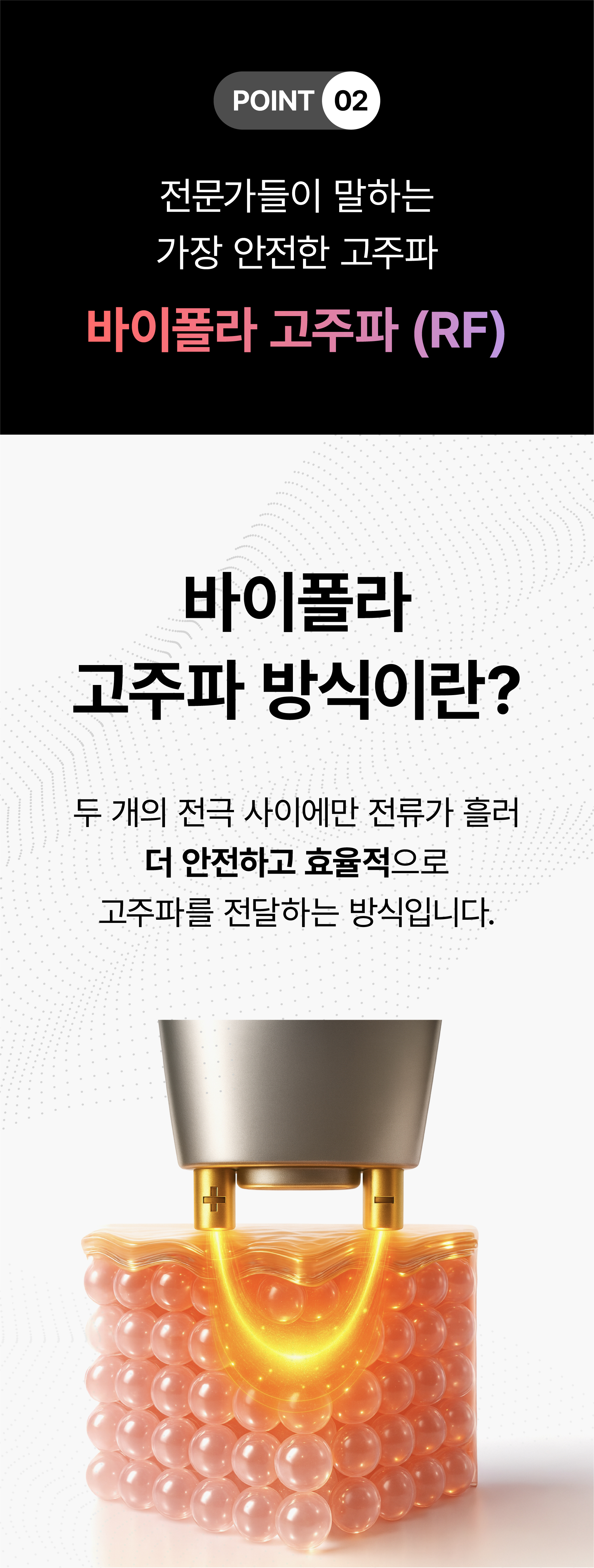 다른 고주파와 달리, 바이폴라 방식은 두 개의 전극 사이에만 전류가 흐르는 구조로 설계되어 있습니다. 이 방식은 에너지 전달 부위를 국소화하여 피부에 가해지는 자극은 최소화하면서도, 진피층까지 고주파 에너지를 안전하고 정확하게 도달시킬 수 있습니다.