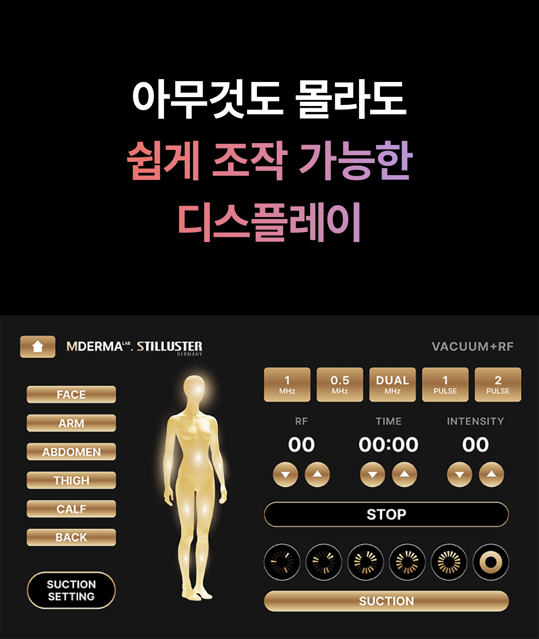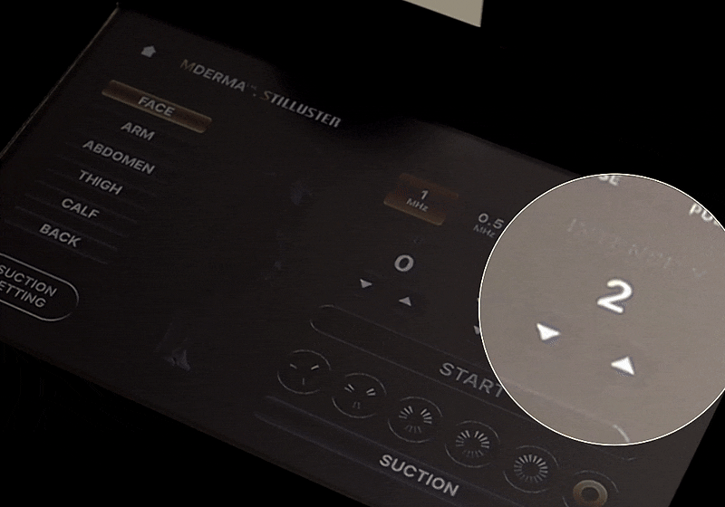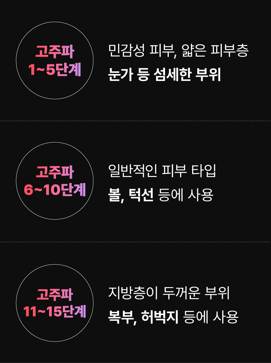 각 부위에 따라 고주파 출력 강도, 흡입 압력, 사용 주파수 모두 자동 또는 수동으로 설정이 가능합니다.