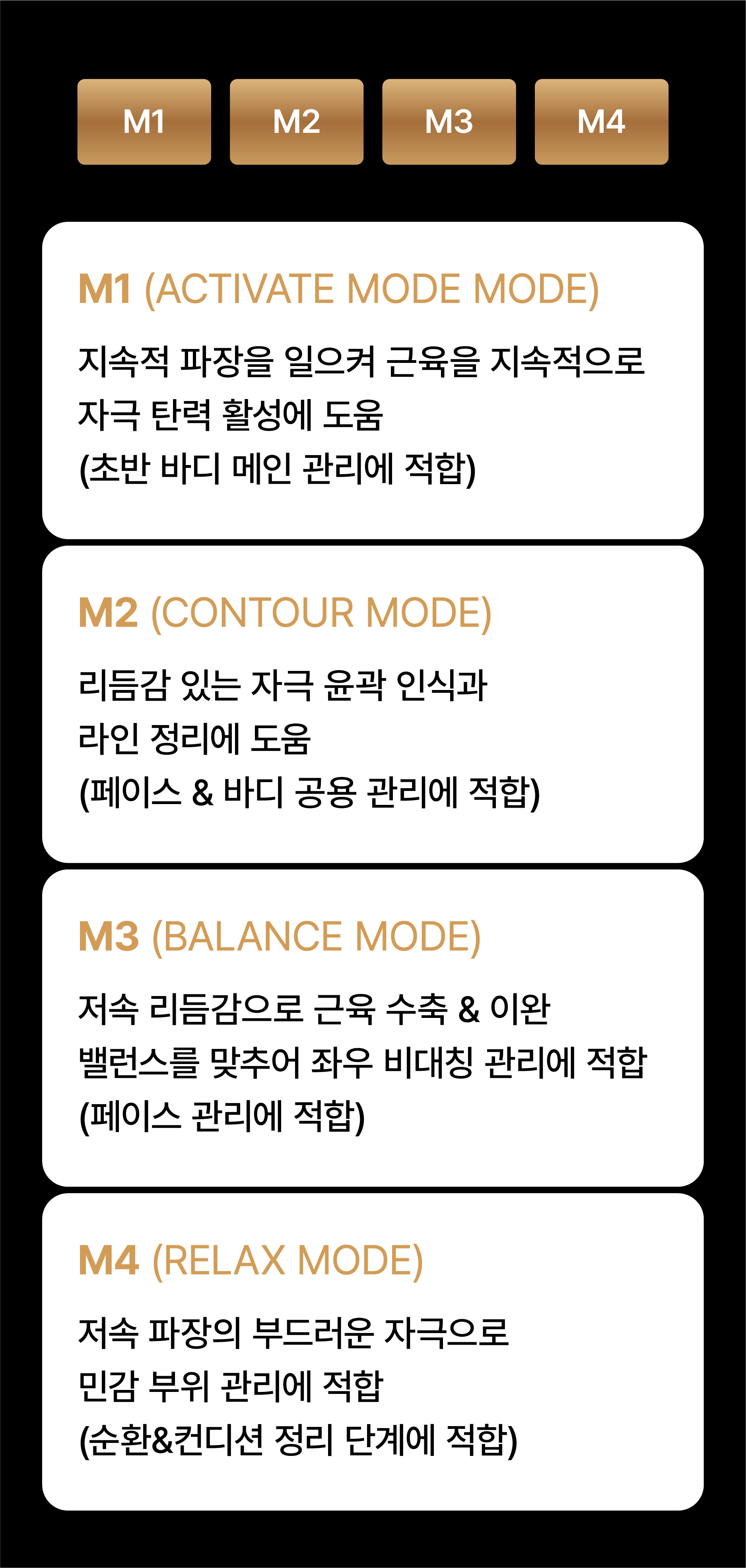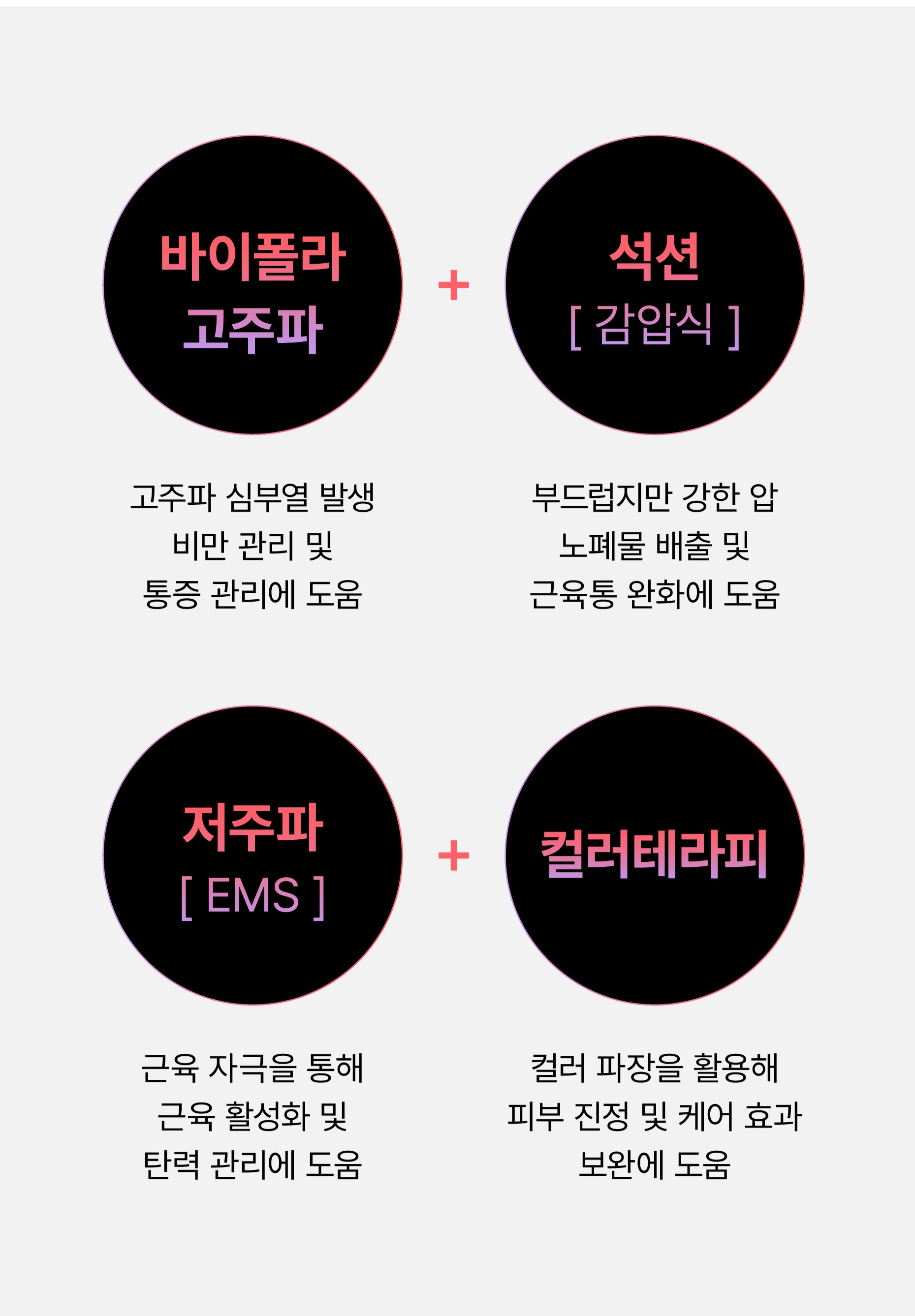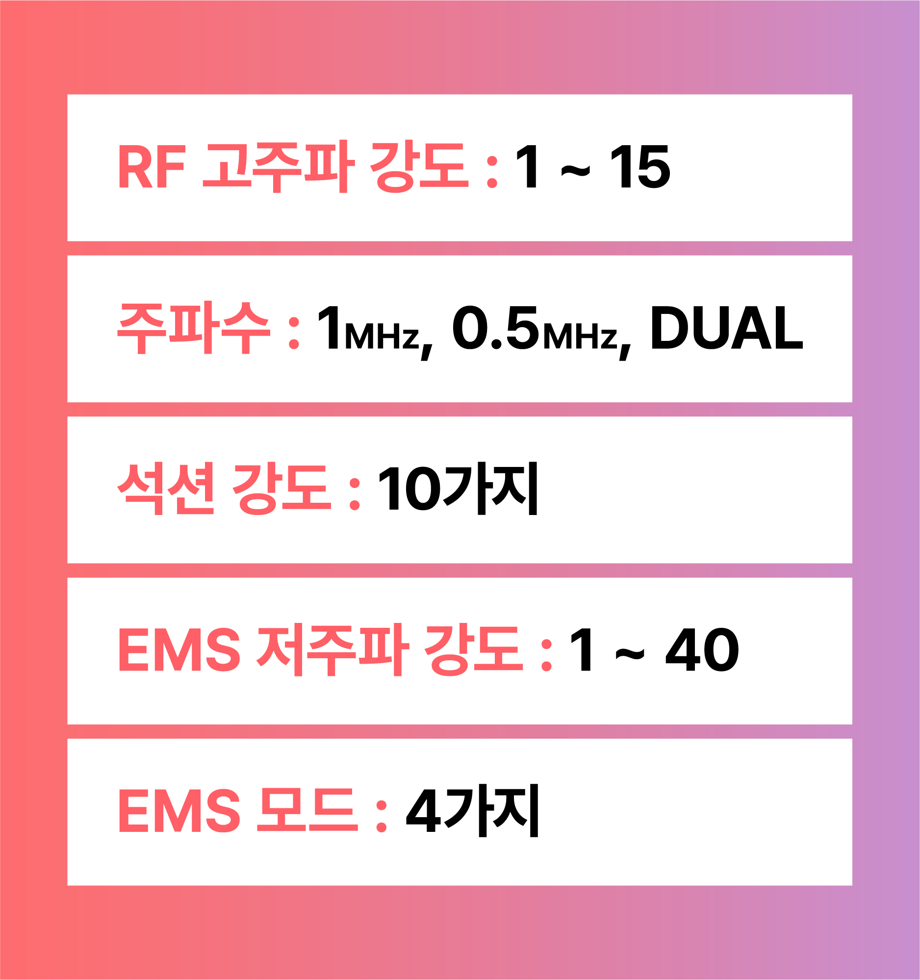 각 부위에 따라 고주파 출력 강도, 흡입 압력, 사용 주파수 모두 자동 또는 수동으로 설정이 가능합니다.