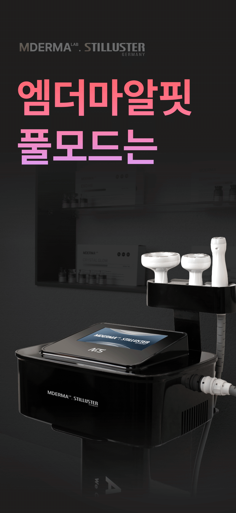 MDERMALAB은 실제 피부샵에서 사용하는 고출력 바이폴라 고주파 기기와 근막층을 자극해주는 감압식 석션 기술을 하나의 홈케어 디바이스에 담았습니다. 기존 홈케어 기기의 한계를 넘어, 에스테틱 고급 장비의 효율을 그대로 유지하면서도 일반 소비자도 손쉽게 사용할 수 있도록 설계했습니다.