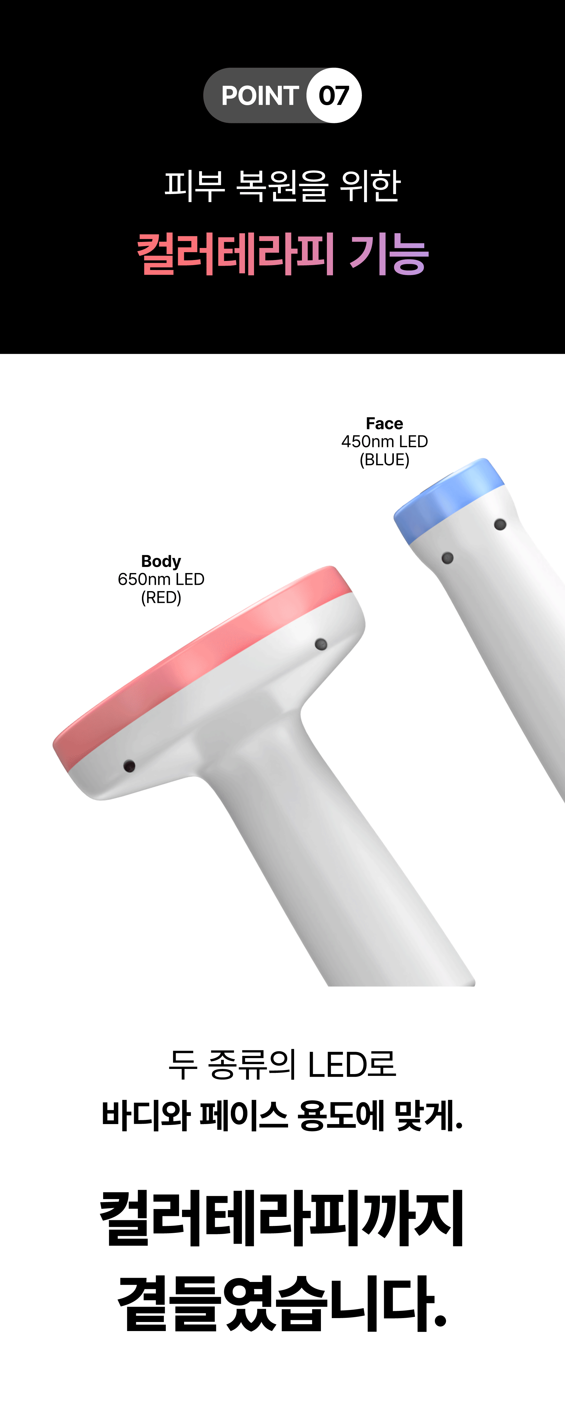 블루 LED는 얕은 피부층에 작용하여항균 및 진정 작용을 돕습니다.