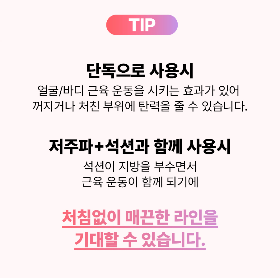 • 피부가 붉게 되거나 따끔거릴 경우에는 출력세기를 줄여 자신의 피부느낌에 맞게 조절하십시오.