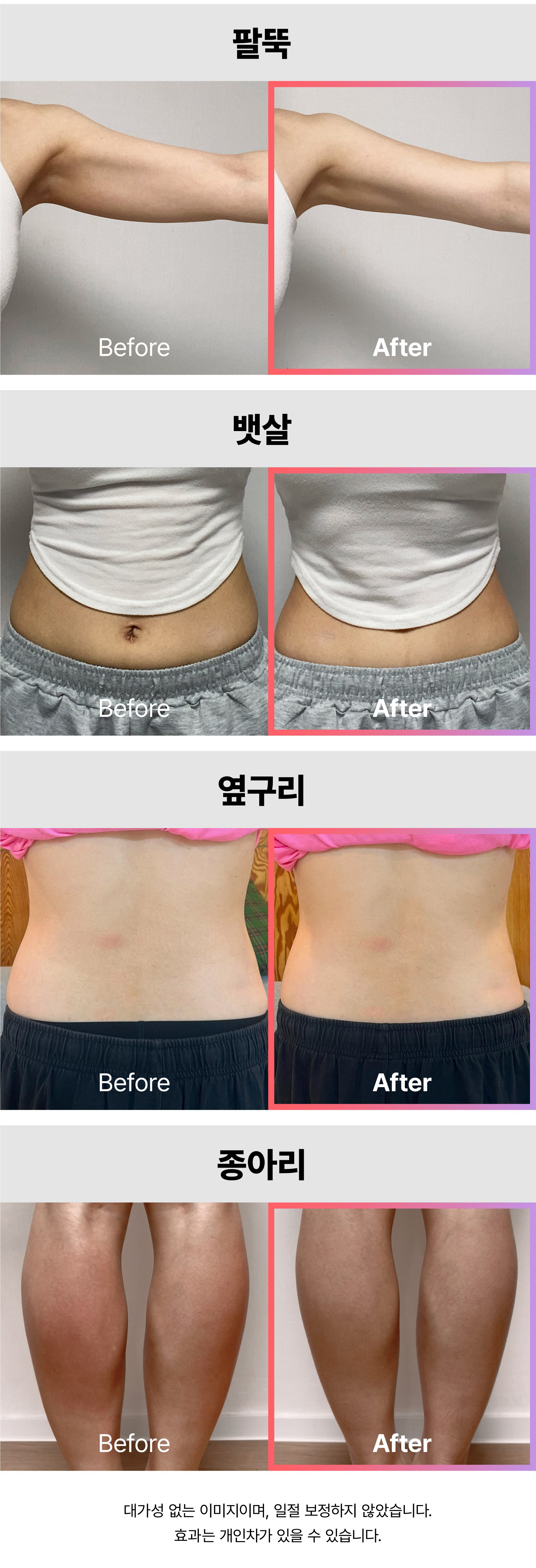 얼굴, 목, 팔뚝, 복부, 허벅지,