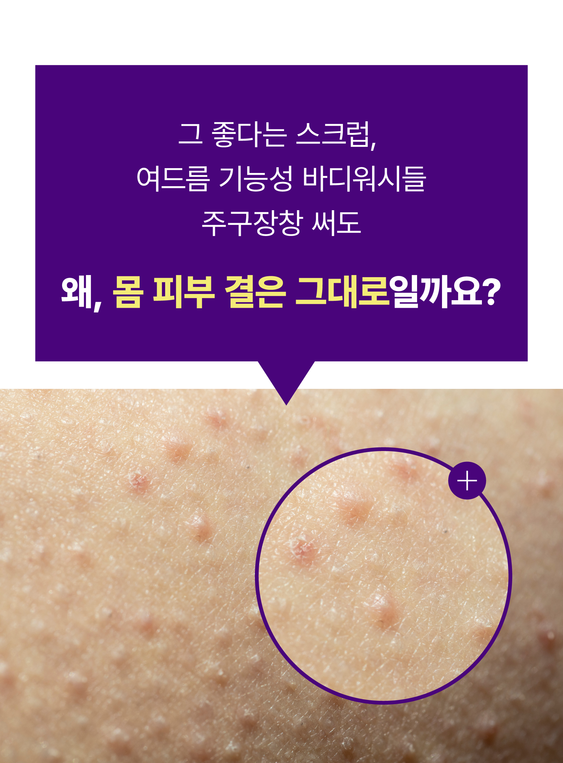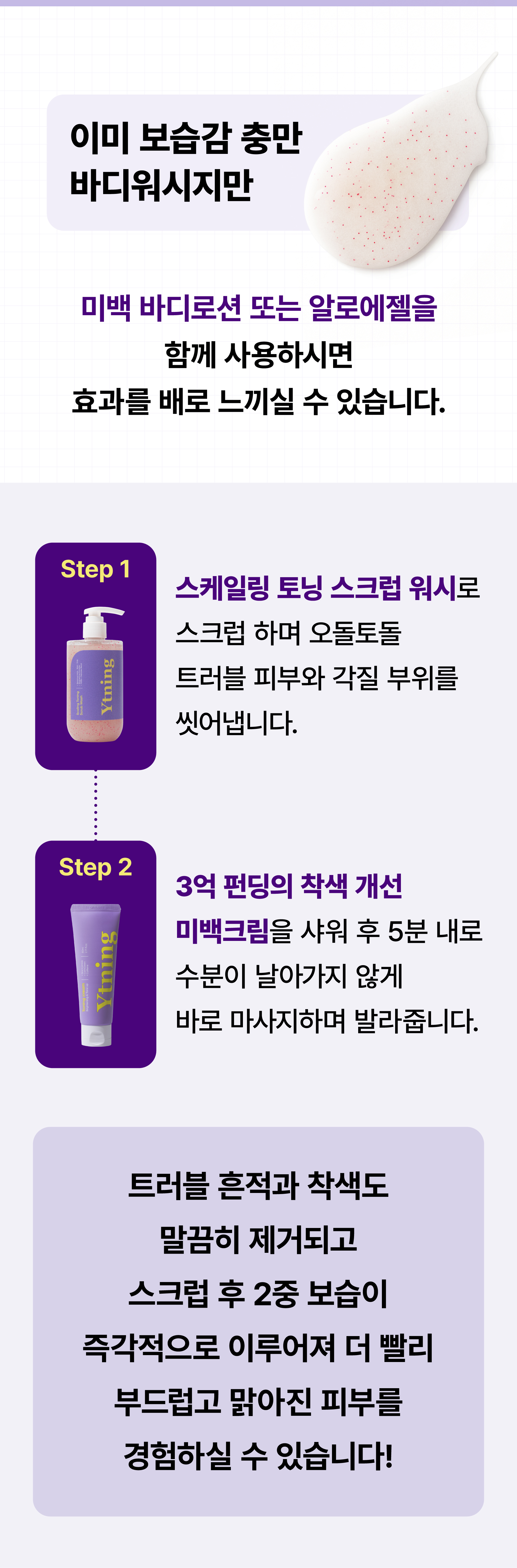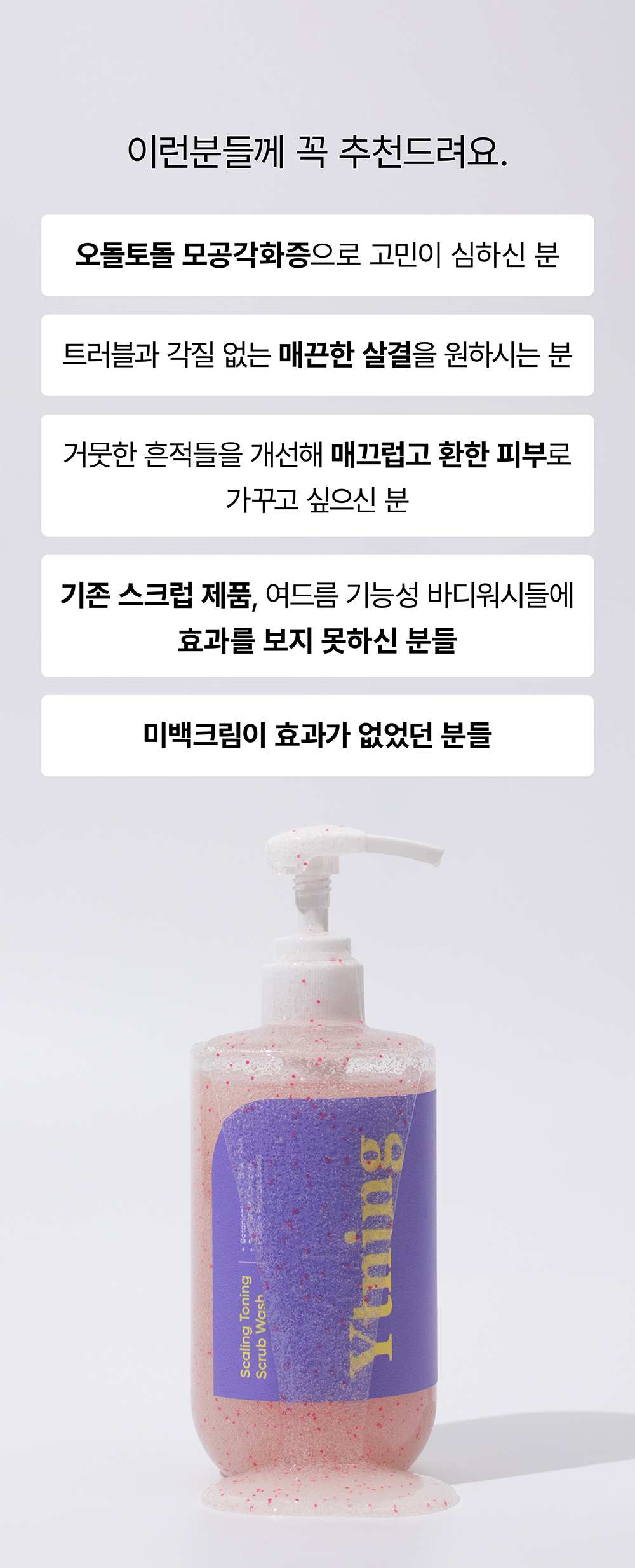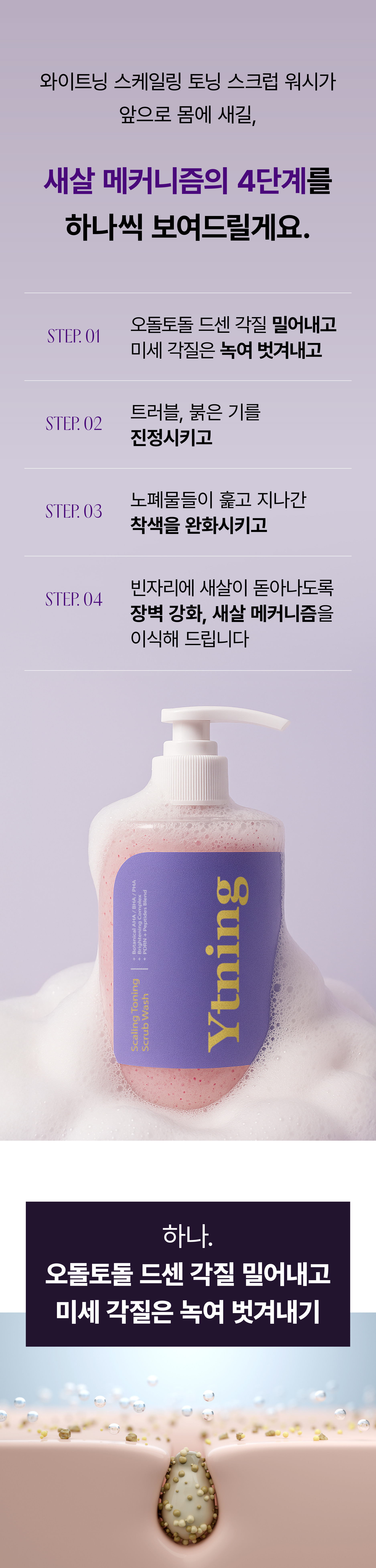 이번 와이트닝 3탄은 호르몬&몸내부 순환이 망가져 외부 환경에 의해 자극을 받아 트러블이 생기고, 오돌토돌한것들이 올라오고, 그것들이 남긴 거뭇한자국들을 해결해주는 바디 스크럽 워시입니다!