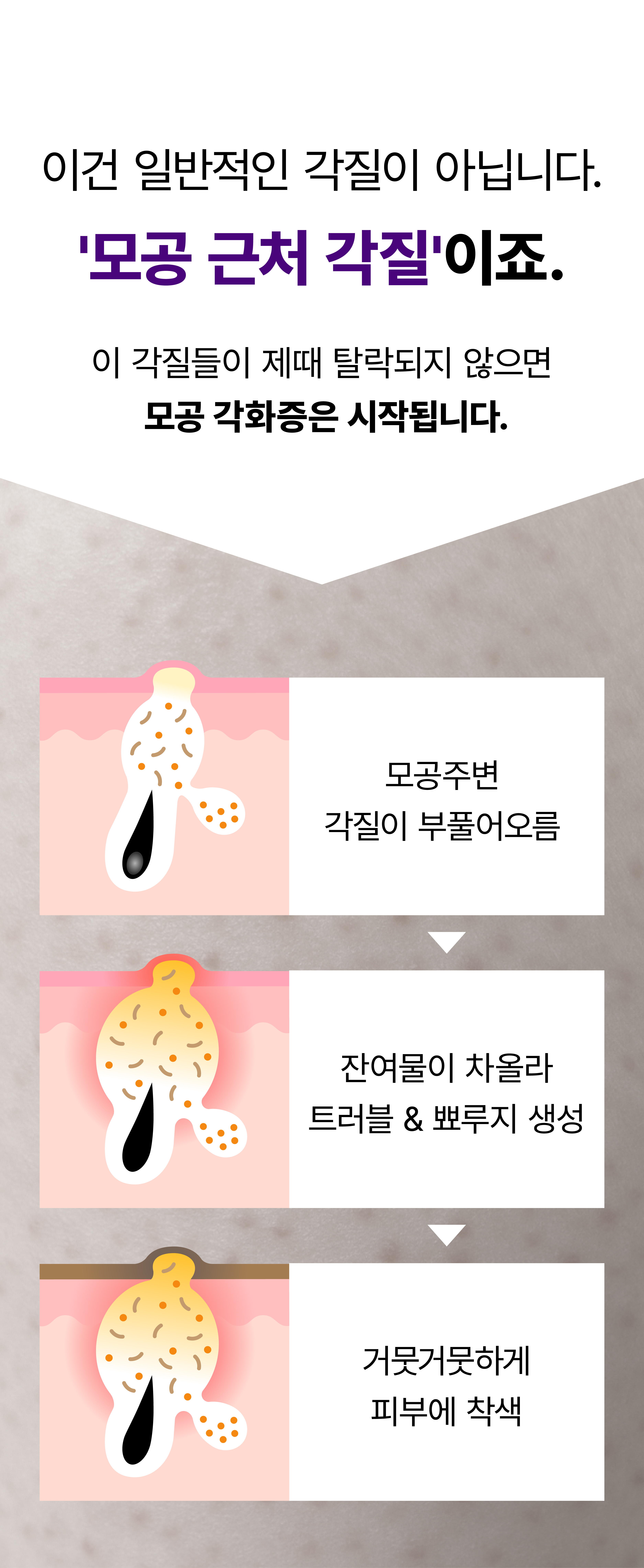 값비싼 미백크림을 발라도, 수분크림을 발라도 스크럽 각질제거를 해도 계속 올라오는 피부 트러블 모공 각화들 그것들이 해결할 수 없었던거 단순히 각질만 제거했거나 단순히 미백만했기 때문이거든요.