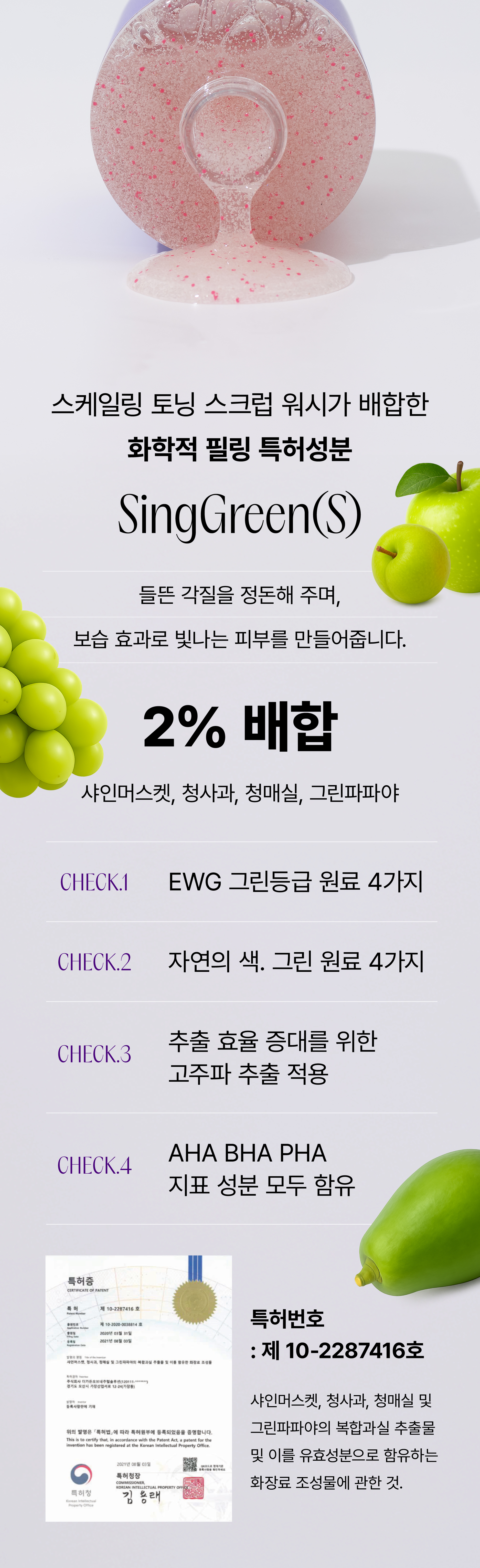 물리적 화이트 스크럽과 핑크활력 비드, 그리고AHA BHA PHA 천연 특허 성분,브라이트닝 성분 2% , 그외 비싼 재생 원료들 부터 바디워시에서는 찾아보실 수 없는 고급 원료들로 꽉 채웠습니다.