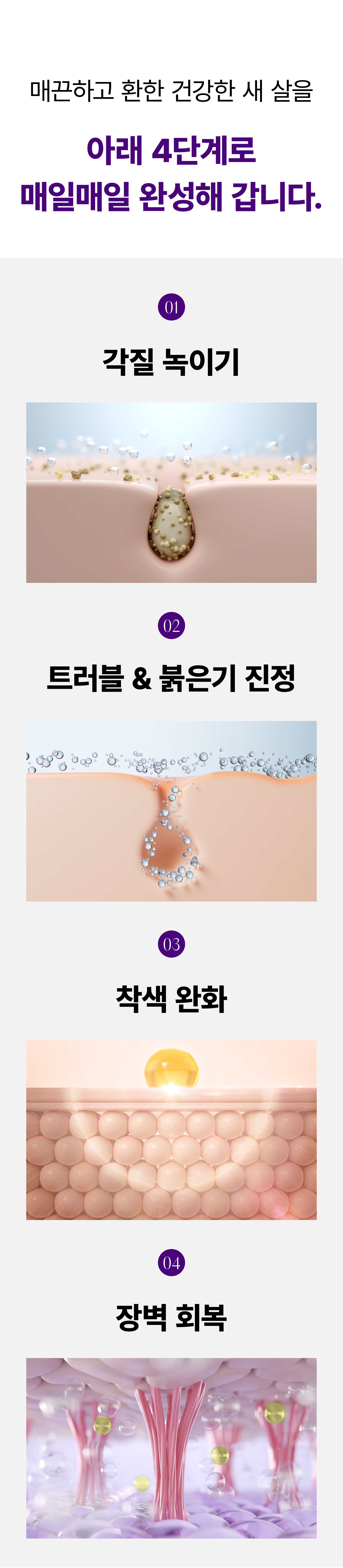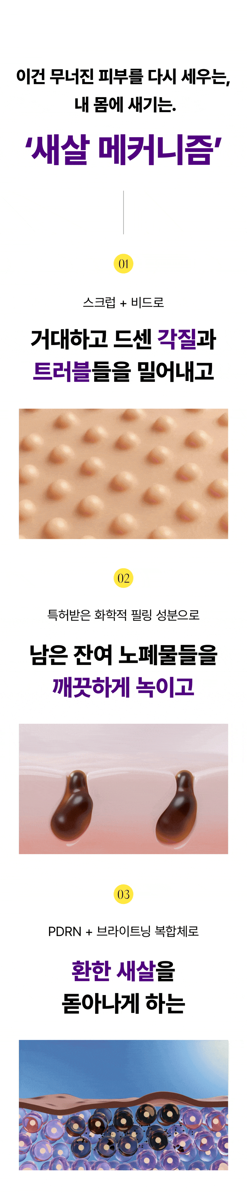 각질연화+스크럽+브라이트닝+재생 을 다 잡아야 새살이 환하게 올라오는 바탕을 만들 수 있기때문에