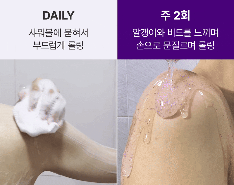 몸에 물을 적시고, 스크럽 워시를 롤링하면서 거품을 내야 미세거품이 각질 제거된 피부 위에 유효 성분이 흡수가 됩니다!