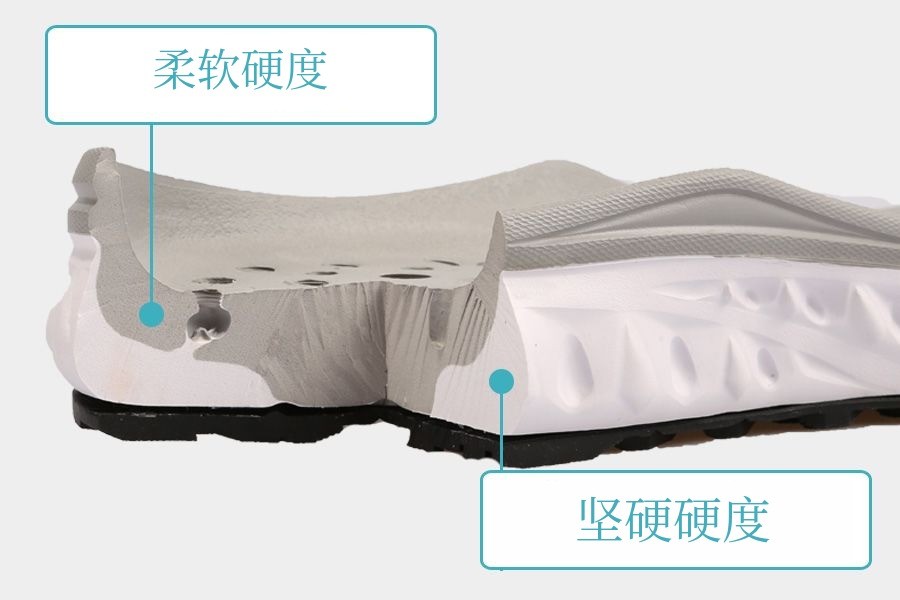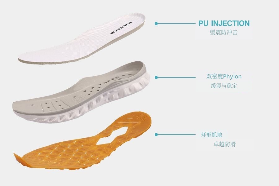 TRAVELER的中底采用两种硬度的注塑Phylon同时成型。中间部分为吸收冲击的柔软硬度材质,左右两侧为需要平衡与稳定性的硬质中底。是一款同时满足缓震与稳定性高难度性能的功能性中底,。