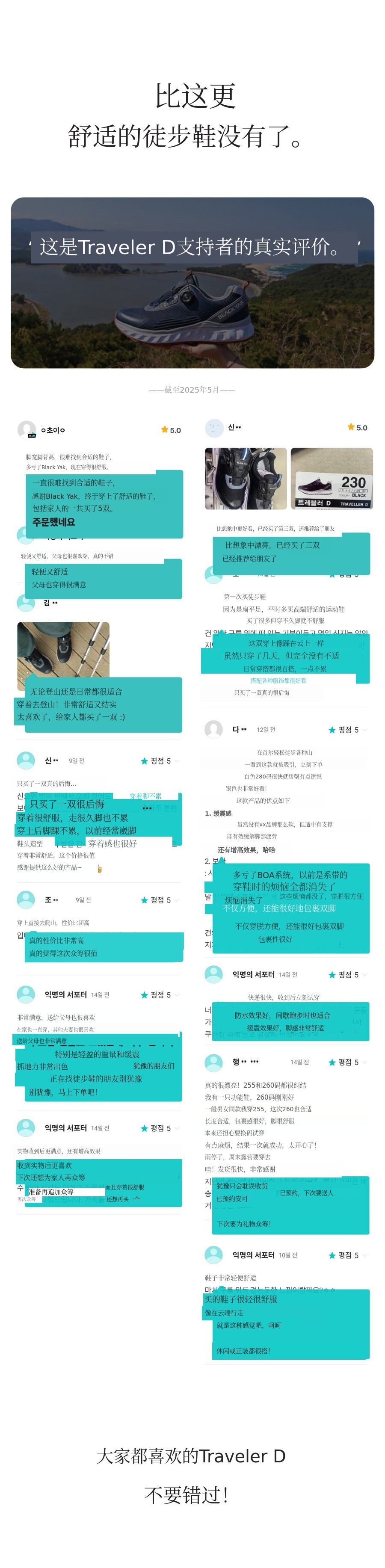 TravelerD是按照穿厚袜子时合适的尺码制作的。多次预售结果显示,大多数支持者都选择了与原有尺码相同的尺码参与项目,尺码问题并不多。此外,TravelerD根据韩国人平均脚型设计,鞋宽和鞋面比其他鞋款更宽松。(以平均脚型为基准进行说明,实际情况可能因人而异。)