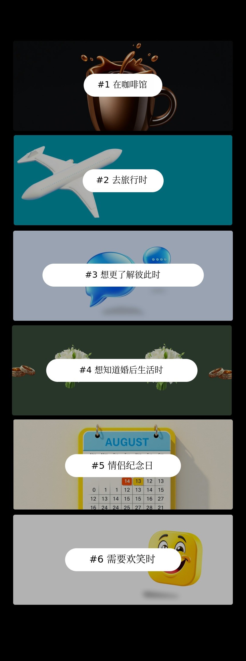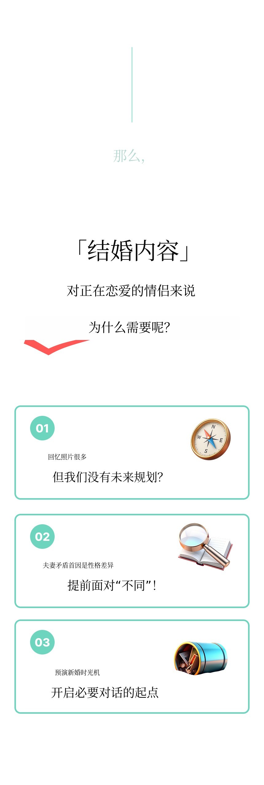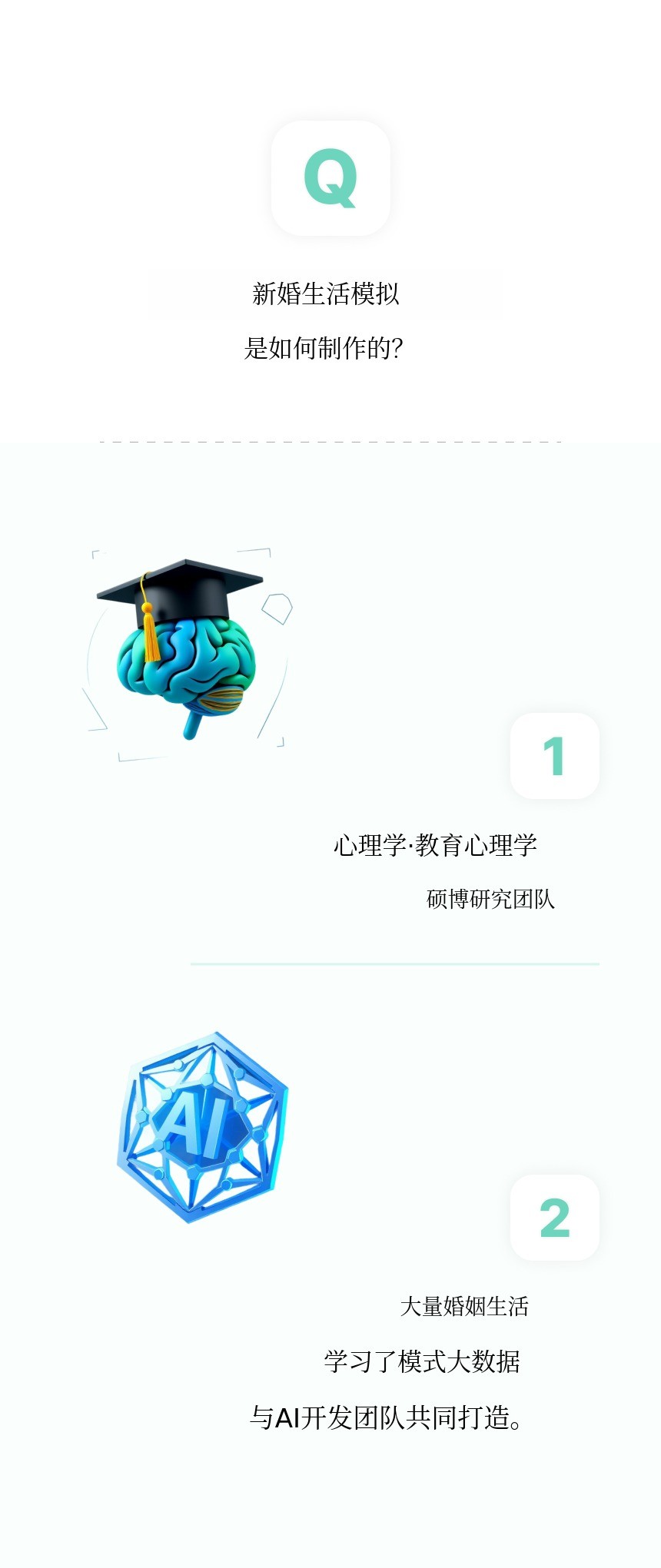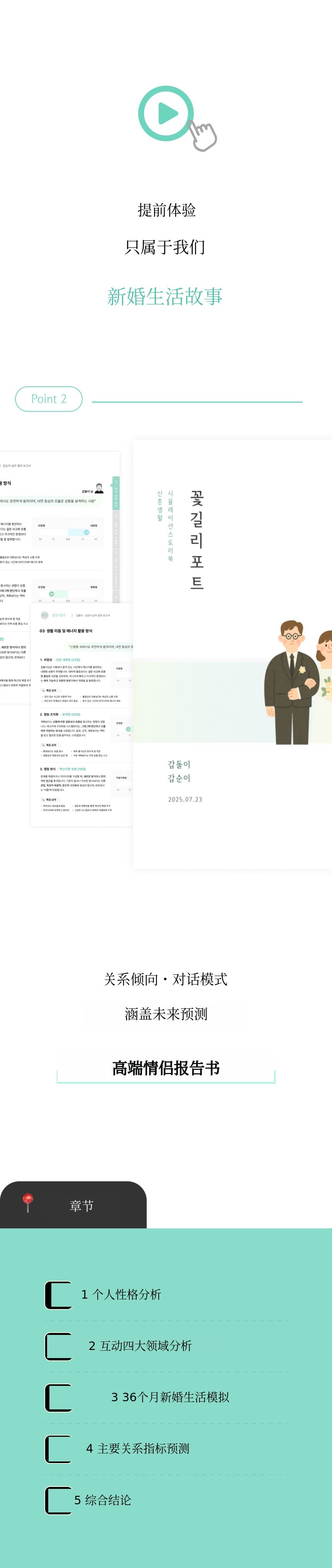 1. 📖 新婚生活模拟故事书 - 基于心理学的12个时间线虚拟体验 2. 💑 情侣定制关系理解 - 心理与性格分析促进深度沟通 3. 📧 个性化PDF报告 - 通过邮件发送,方便随时查看