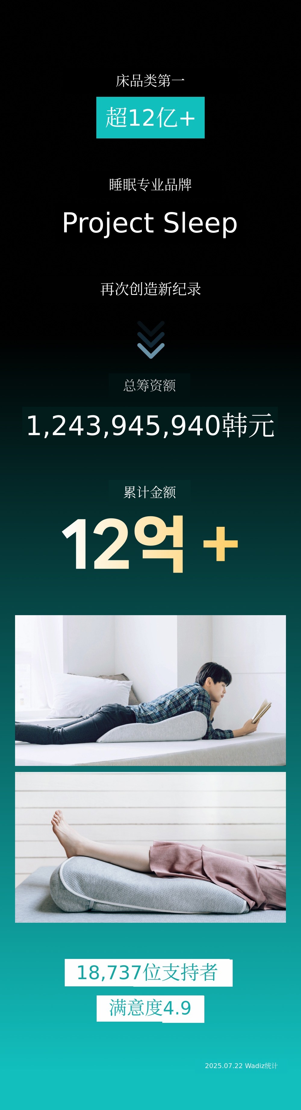 Project Sleep的第一个项目——床垫,在网络渠道上获得了高达97%的客户满意度(自家商城统计:2025.04),率先保障了优质睡眠的基本权利。我们不仅仅止步于床垫,还投入了大量的思考、时间和努力,开发枕头、寝具等更多帮助大家获得好睡眠的产品。我们认为Wadiz是能够详细传达Project Sleep真诚与开发过程的最佳空间,因此在Wadiz介绍我们的项目。