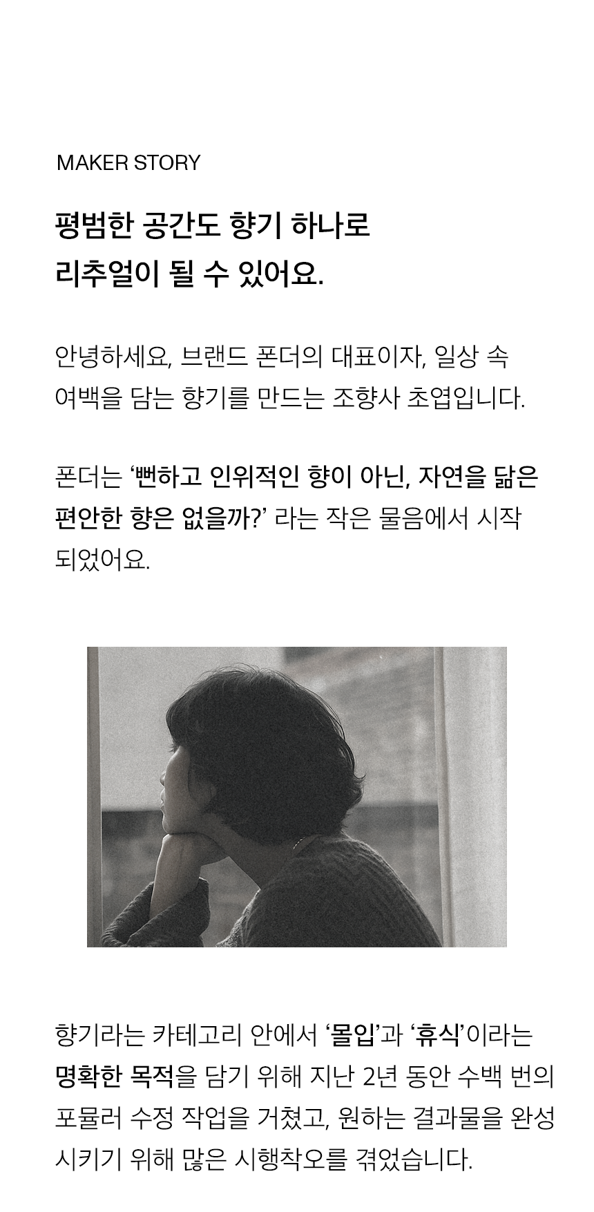 폰더는 이번 펀딩을 통해 단순히 제품을 선보이는 것이 아니라, “우리의 이야기에 공감하고 함께 걸어가 줄 첫 동반자”를 찾고자 합니다. 와디즈야말로 그 진정성 있는 첫 여정을 함께할 수 있는 곳이라 확신하며, 저희의 첫 런칭 무대로 선택하게 된 이유입니다.