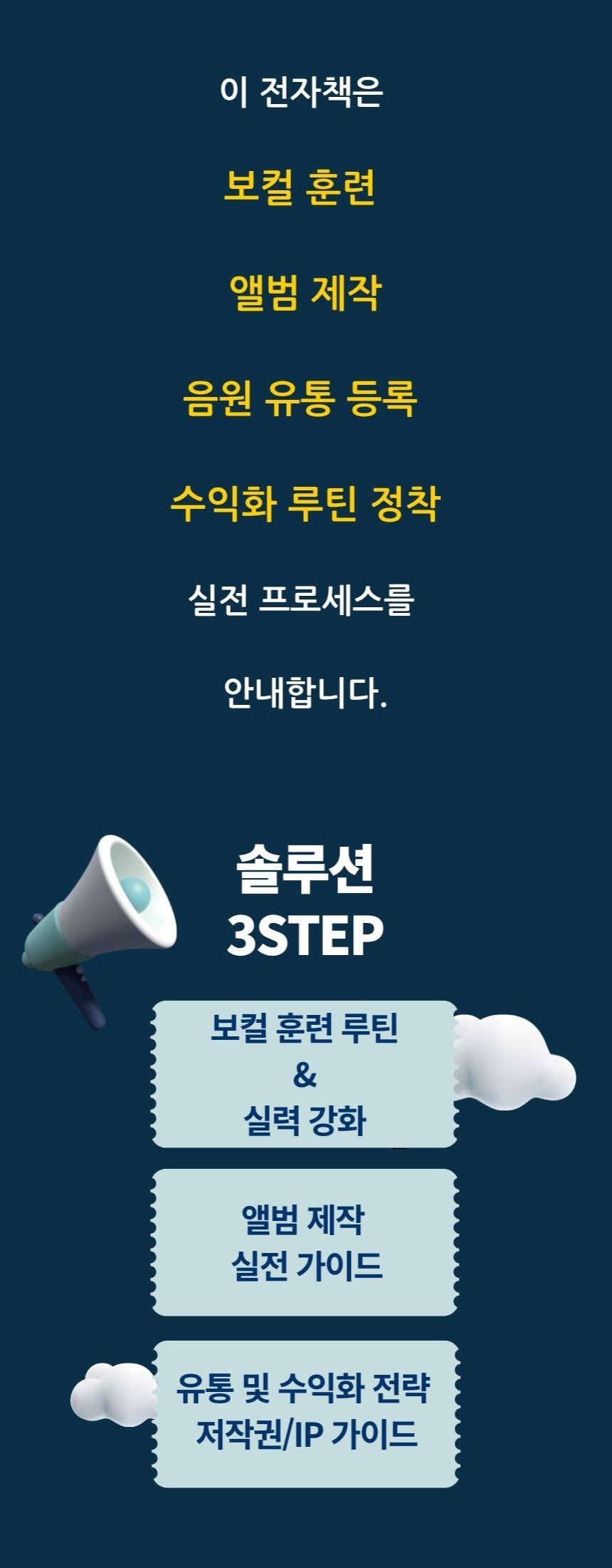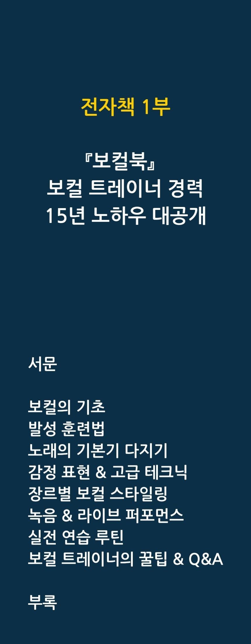 15년간 보컬 트레이너와 디렉터로 활동하며, 이 과정을 제대로 알려주는 실전 가이드가 필요하다는 것을 절실히 느꼈습니다. 그래서 이 전자책은 ‘보컬 트레이닝부터 음원 제작과 수익화까지, 한 권으로 끝내는 실전 가이드북’을 목표로 탄생했습니다.