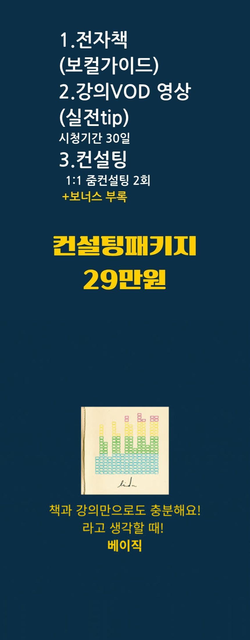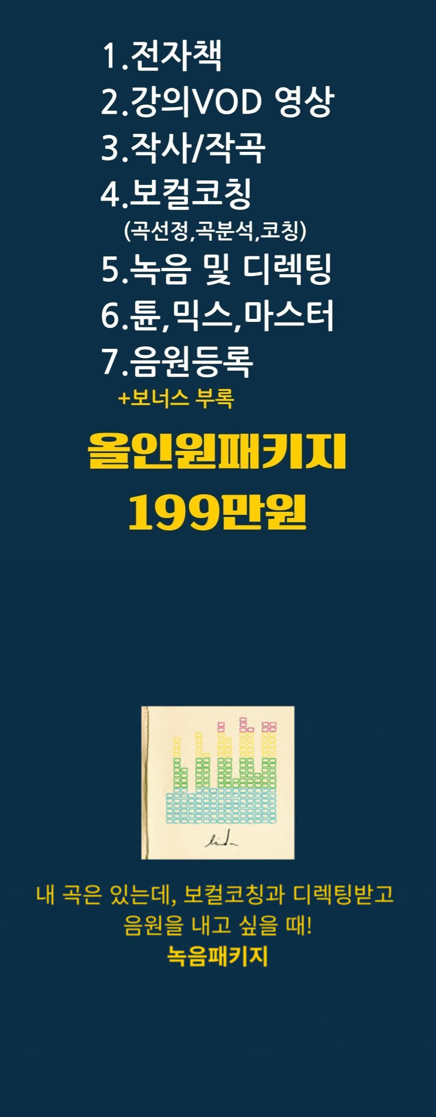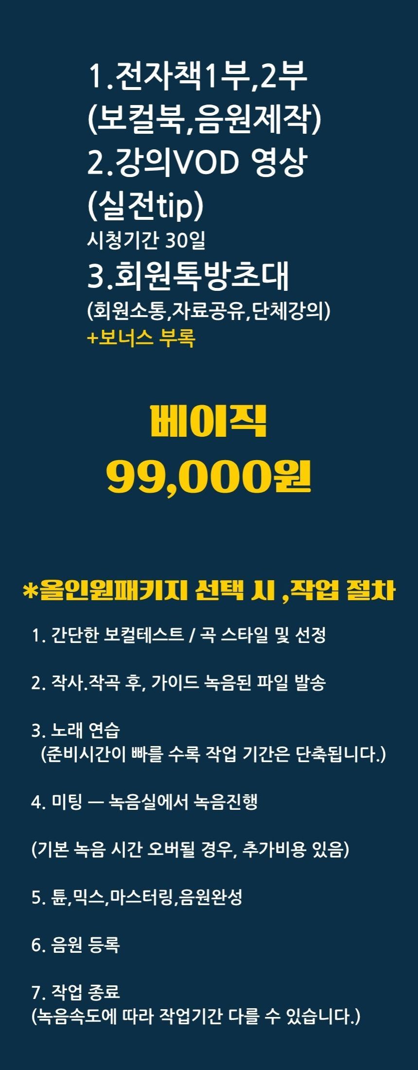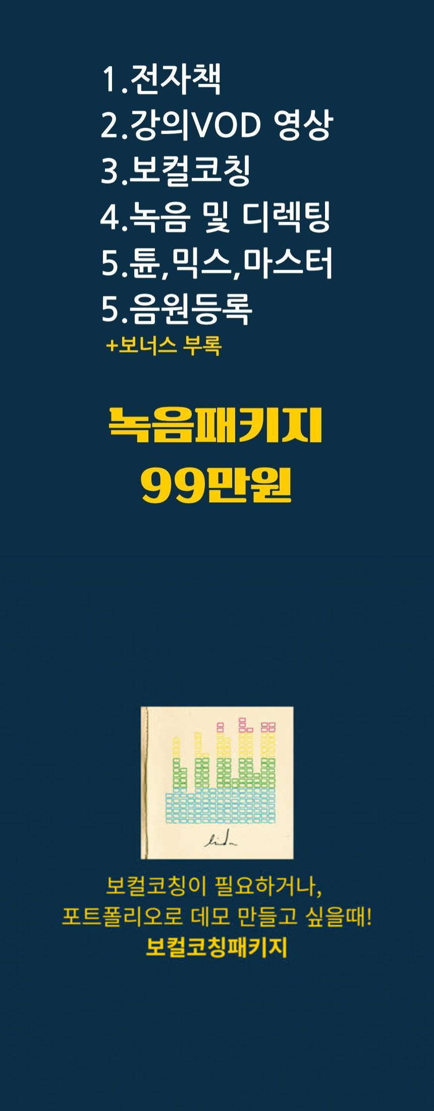 *수강 구성 : 전자책 다운로드 + 강의영상시청(30일)1:1 컨설팅, 보컬 코칭, 녹음 및 앨범 제작은 별도 개별 연락을 통해 진행됩니다.