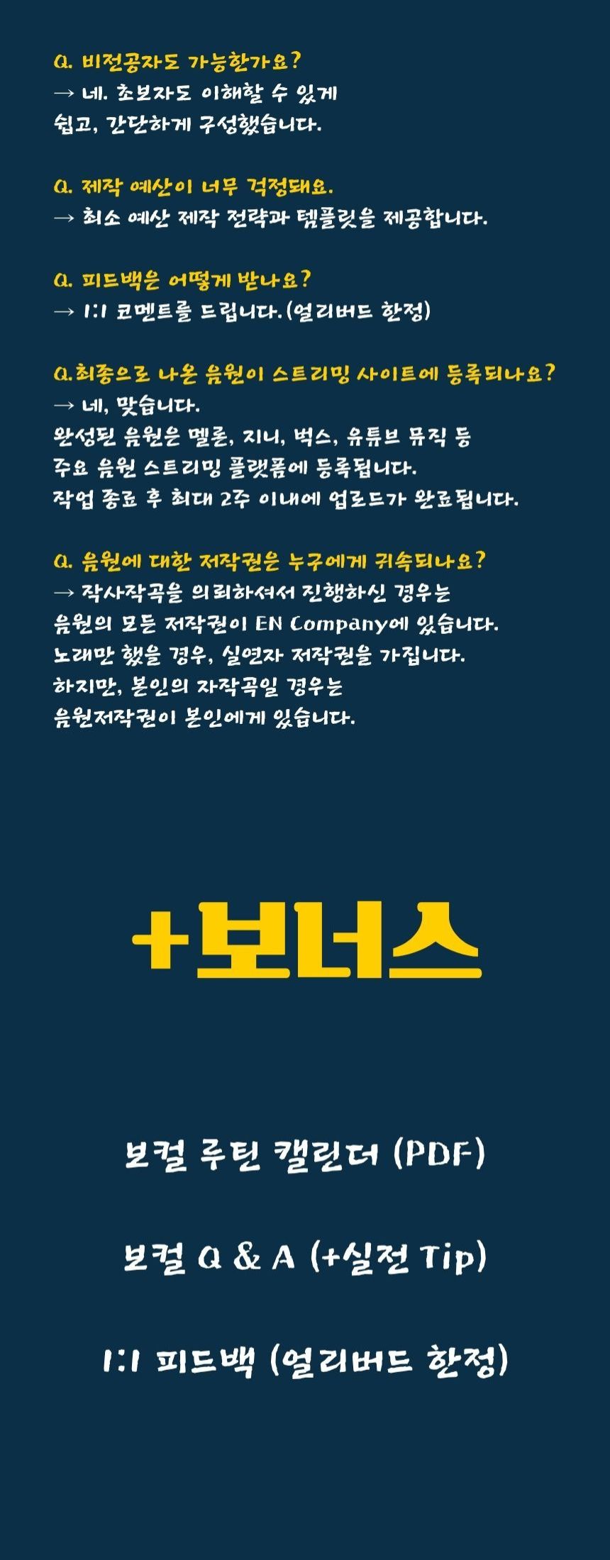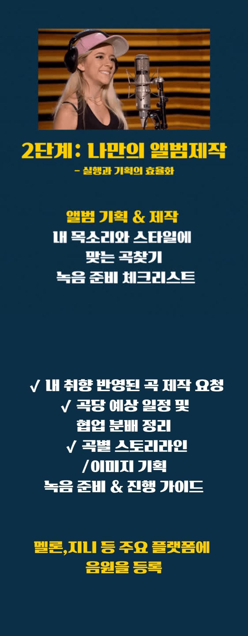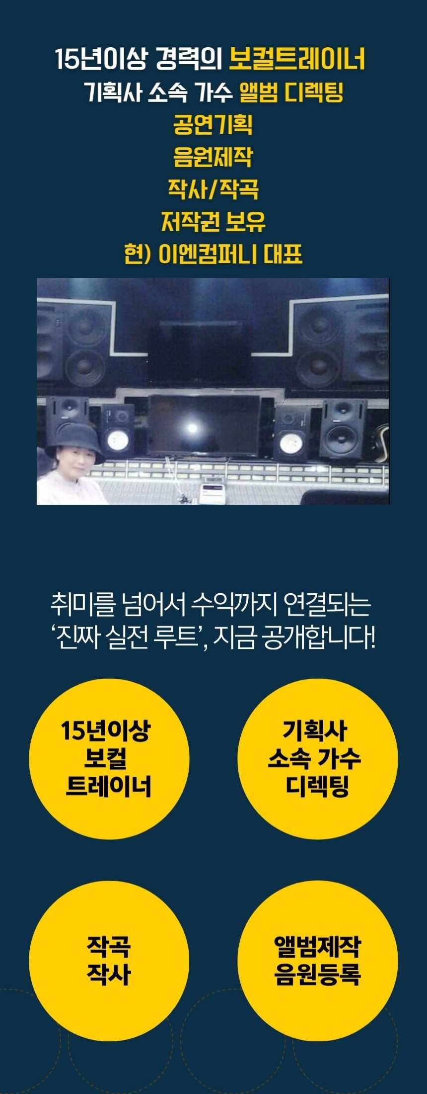 *수강 구성 : 전자책 다운로드 + 강의영상시청(30일)1:1 컨설팅, 보컬 코칭, 녹음 및 앨범 제작은 별도 개별 연락을 통해 진행됩니다.