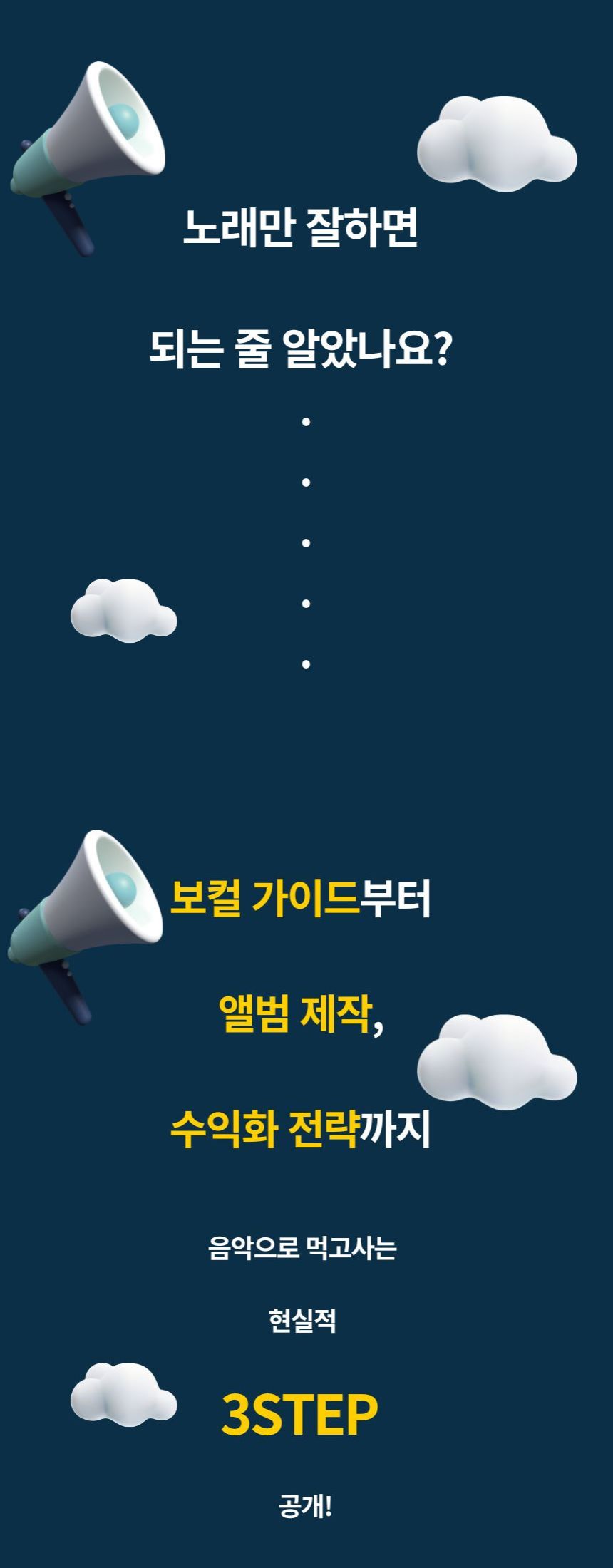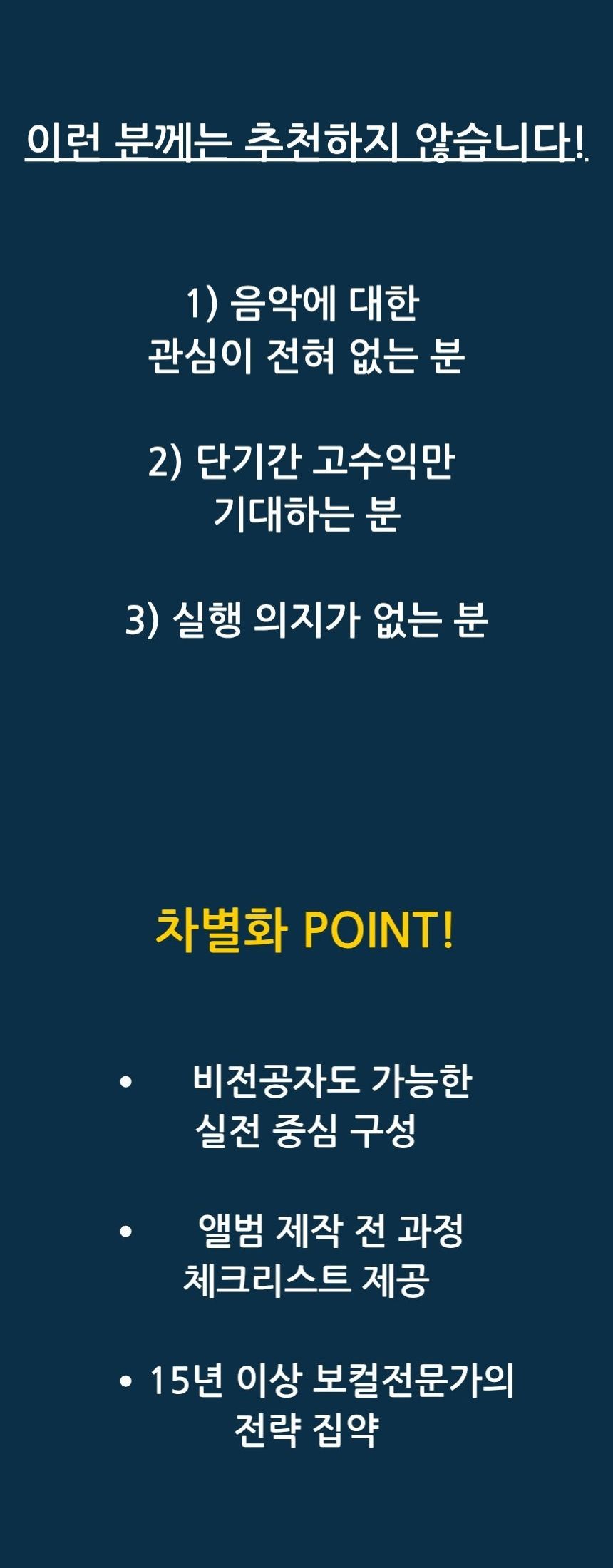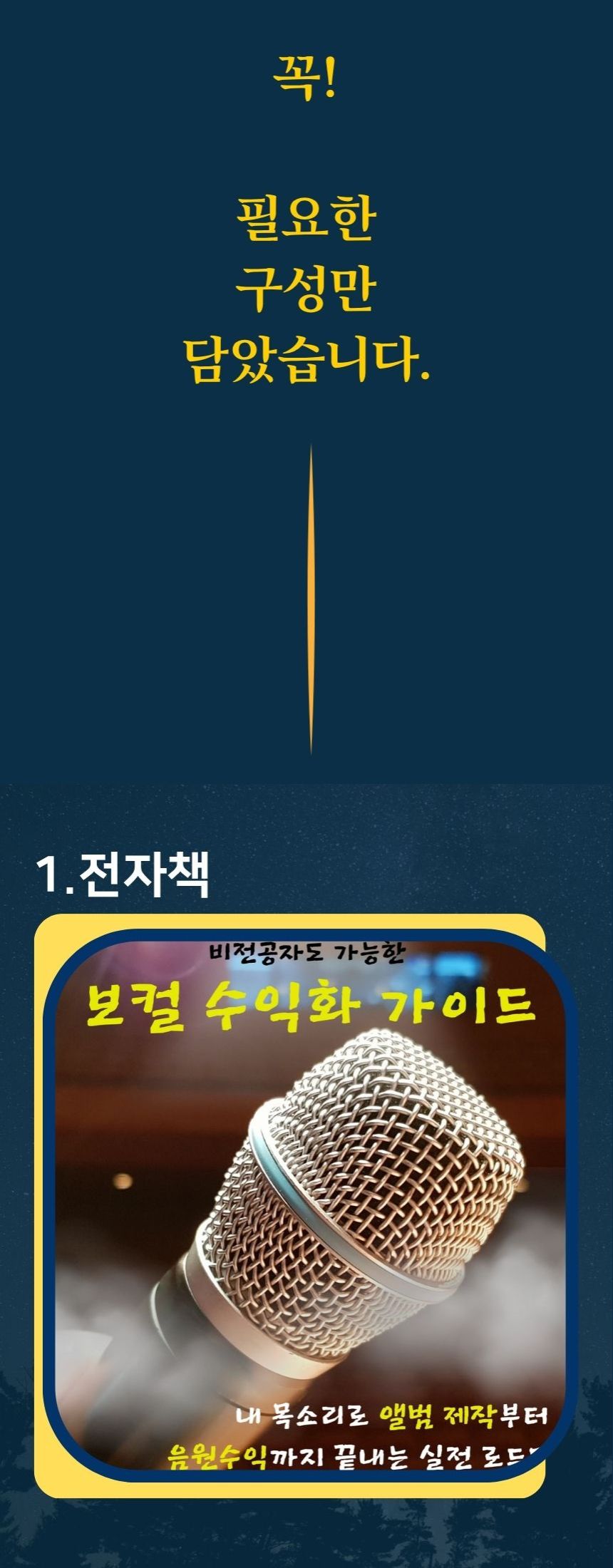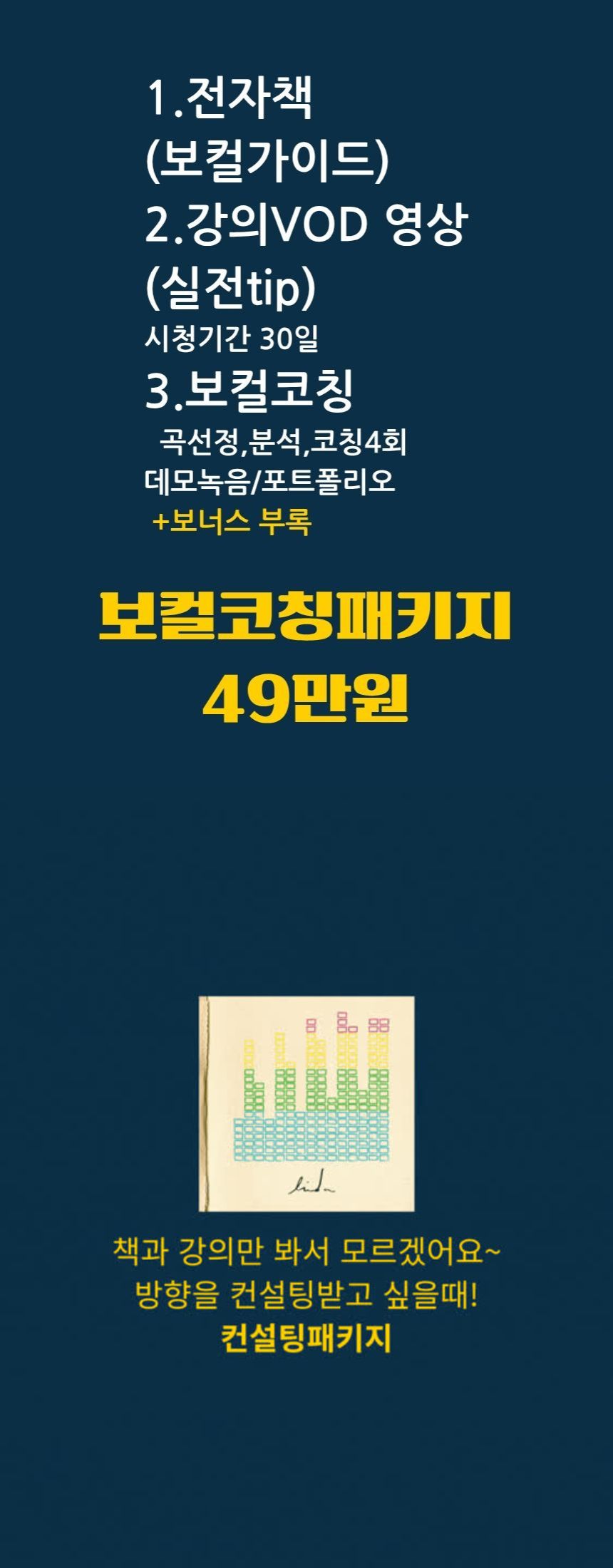 *수강 구성 : 전자책 다운로드 + 강의영상시청(30일)1:1 컨설팅, 보컬 코칭, 녹음 및 앨범 제작은 별도 개별 연락을 통해 진행됩니다.