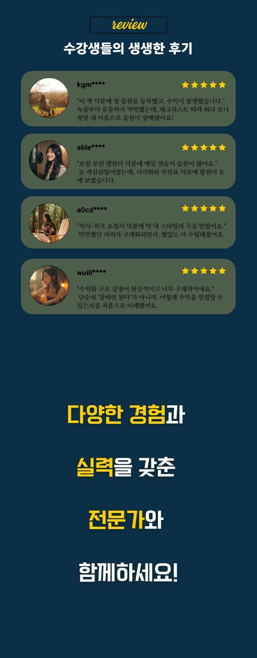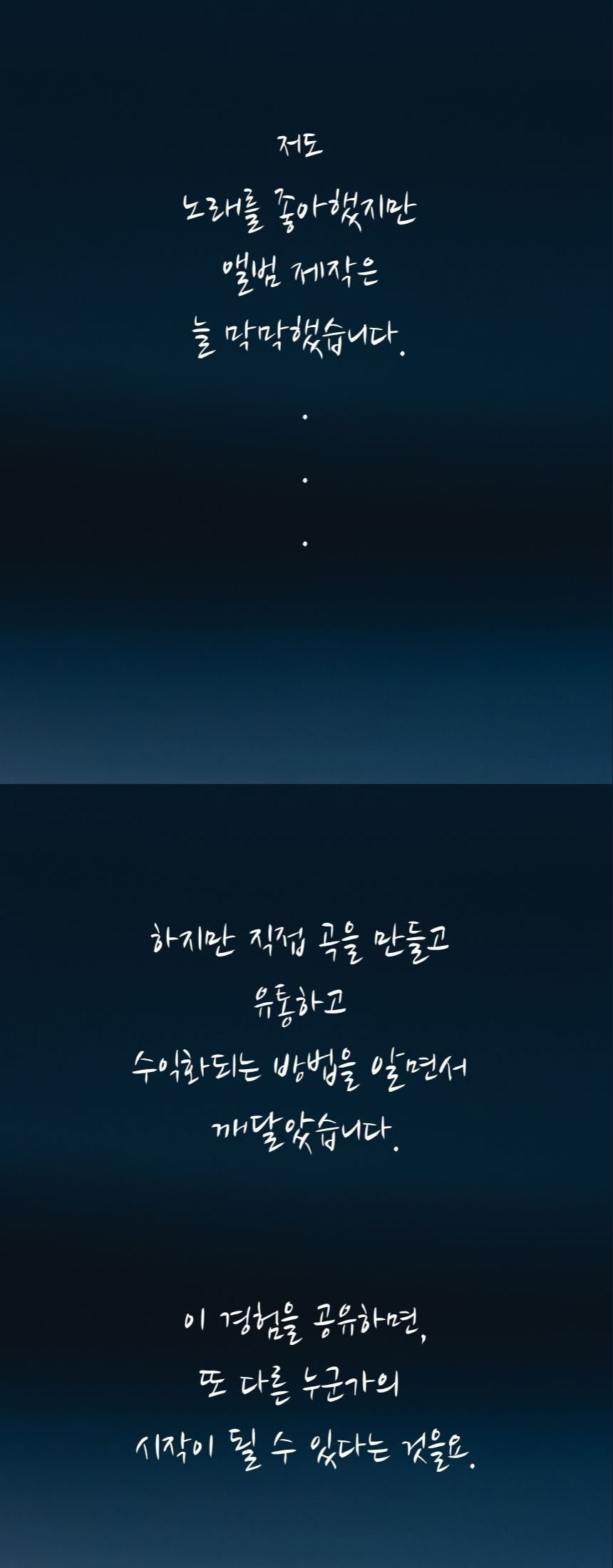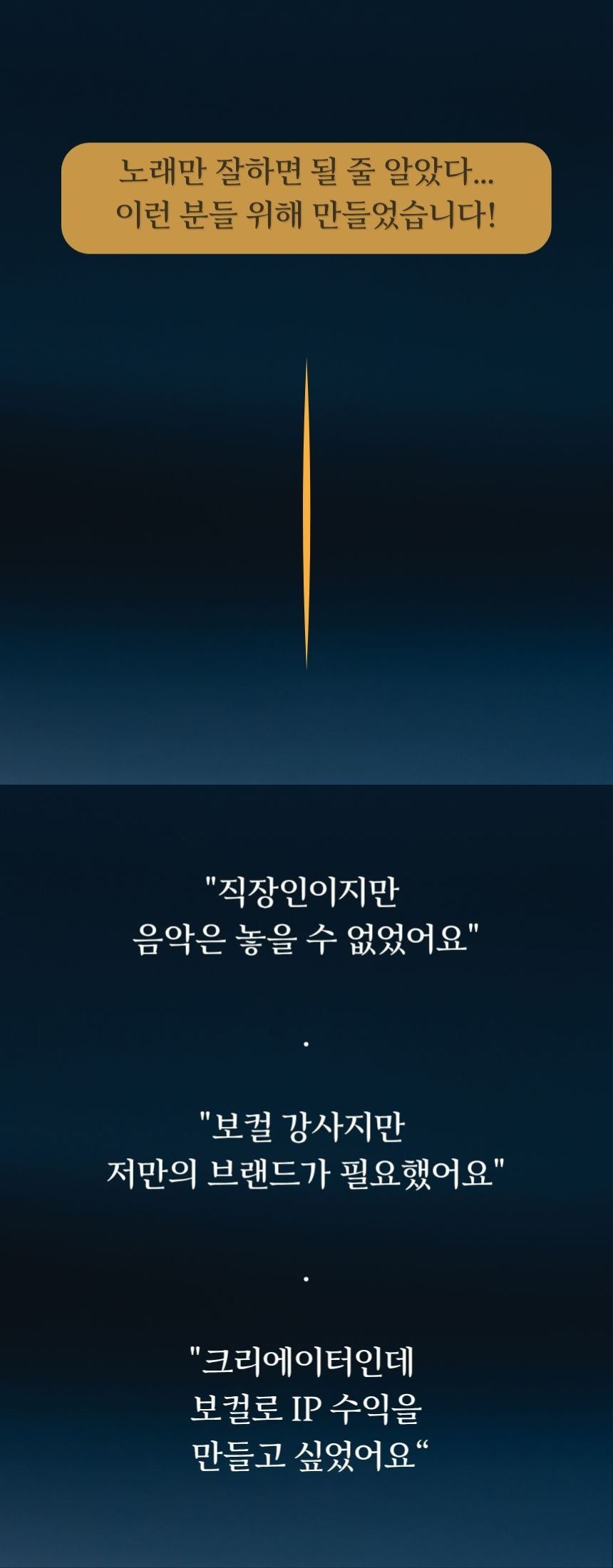 음악을 사랑하지만 어떻게 시작해야 할지 몰랐던 분들, 보컬 트레이닝을 받으며도 막막했던 분들, 완성한 곡을 세상에 어떻게 내놓아야 할지 몰랐던 많은 아티스트들을 만나며, 저 역시 같은 고민을 수없이 했습니다.