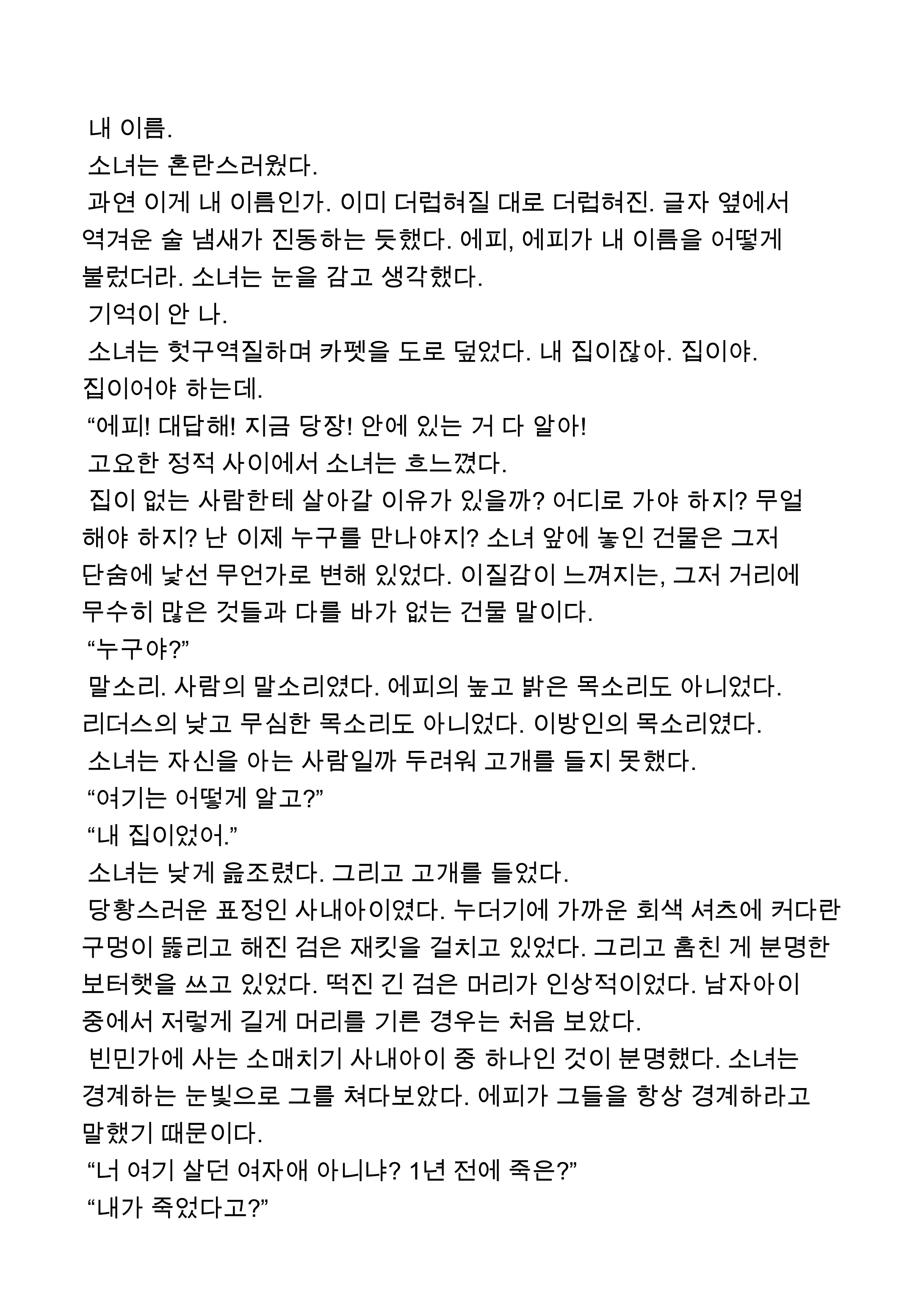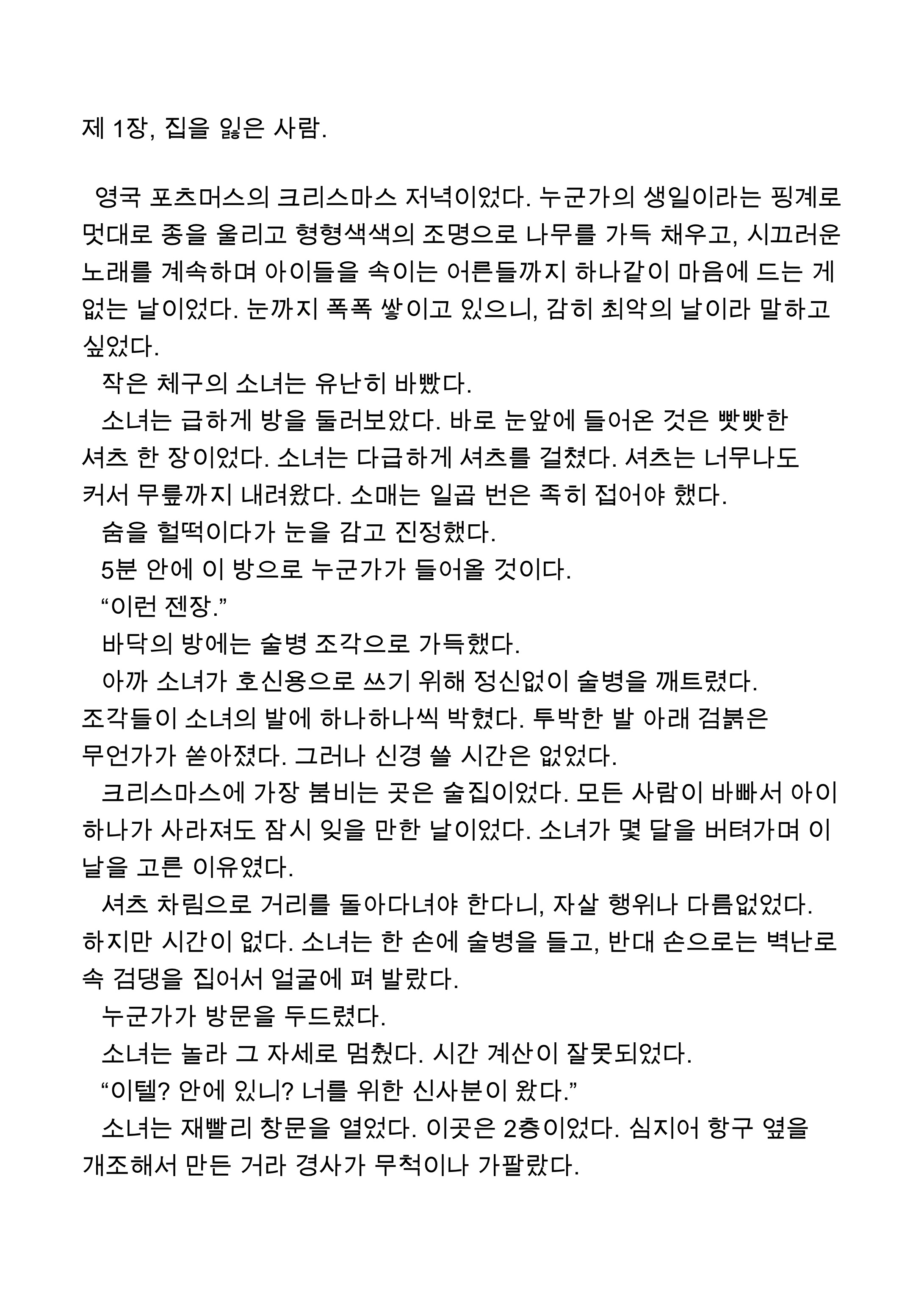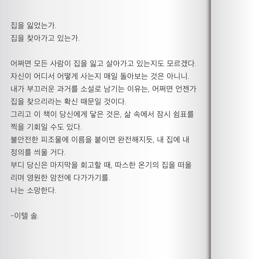 | 고1 겨울방학에, 글쓰기를 시작함과 동시에 바로 주제를 잡게 되었습니다. 오전 7시에 집에서 나가고 저녁 11시에 들어오는 생활에 집에 대한 회의감을 느끼던 참이었어요. 지금 생각하면, 천천히 독서실에서 말라 죽어갔던 것 같습니다. 아마 이런 기분은 학생뿐 아니라 성인들도 여러 번 마주했을 거라 생각합니다. 2월에는 학원을 줄이고 집에서 시간을 보내게 되며, 집에 대한 물음을 계속해서 던졌습니다. 그러다가 솔을 자신의 모든 것인 집을 잃은 사람으로 설정하게 되었습니다. 그걸 시작으로, 1장, '집을 잃은 사람'을 작성하게 된거죠. |