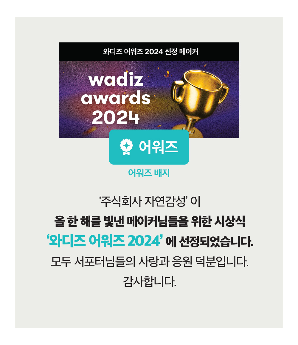 저희 자연감성은 "Eco-Friendly" 라는 슬로건으로 지속 가능한 환경을 만들기 위해 노력하고 있습니다. 이를 통해 서포터님들의 삶에 환경의 소중함과 행복의 가치를 전달하는 작은 매개체가 되기 위해 노력하고 있습니다.