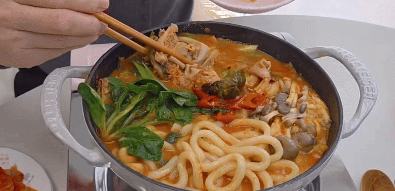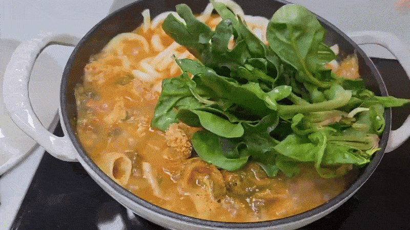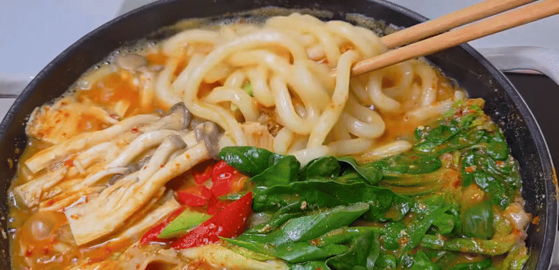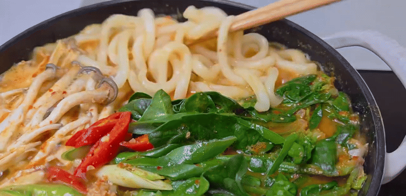 우동, 시금치,버섯, 고추, 파 등 좋아하는 재료를 툭툭 넣어보세요.